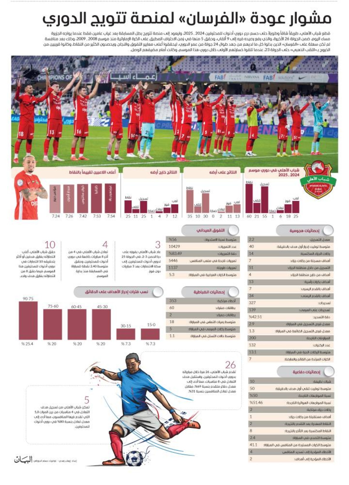 وذلك بعد منافسة لم تكن سهلة على «الفرسان» الذين بذلوا كل ما لديهم من جهد طوال 24 جولة من عمر الدوري، ليحققوا أعلى معايير التفوق والنجاح، ويحصدون الكثير من النقاط، وكانوا قريبين من الخروج بـ«اللقب الذهبي» حتى الجولة 23، عندما تلقوا خسارتهم الأولى خلال دوري هذا الموسم، وكانت أمام مضيفهم الوصل.