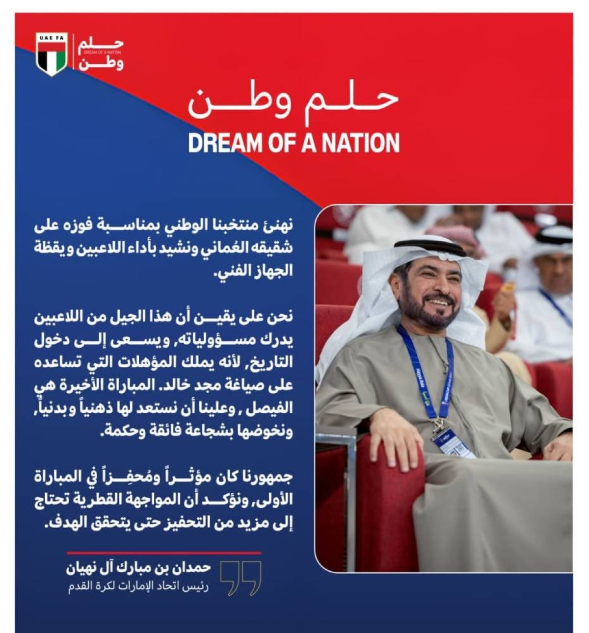 ودعا معالي الشيخ حمدان بن مبارك أسرة المنتخب الوطني إلى الاستفادة من دروس التجربة العمانية، والتركيز على المباراة الأخيرة, وقال: نحن على يقين أن هذا الجيل من اللاعبين يدرك مسؤولياته, ويسعى إلى دخول التاريخ وكتابة فصل جديد للكرة الإماراتية, لأنه يملك المؤهلات التي تساعده على صياغة مجد خالد. المباراة الأخيرة هي الفيصل, وعلينا أن نستعد لها ذهنياً وبدنياً, ونخوضها بشجاعة فائقة وحكمة.