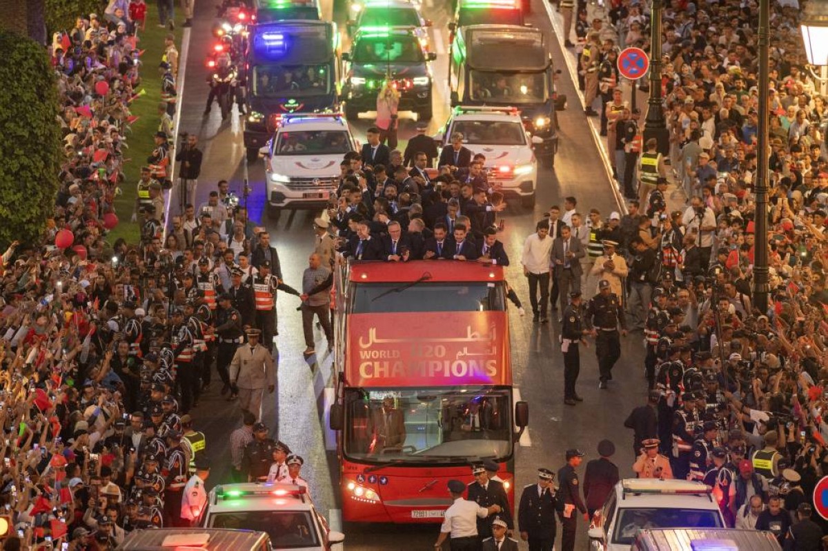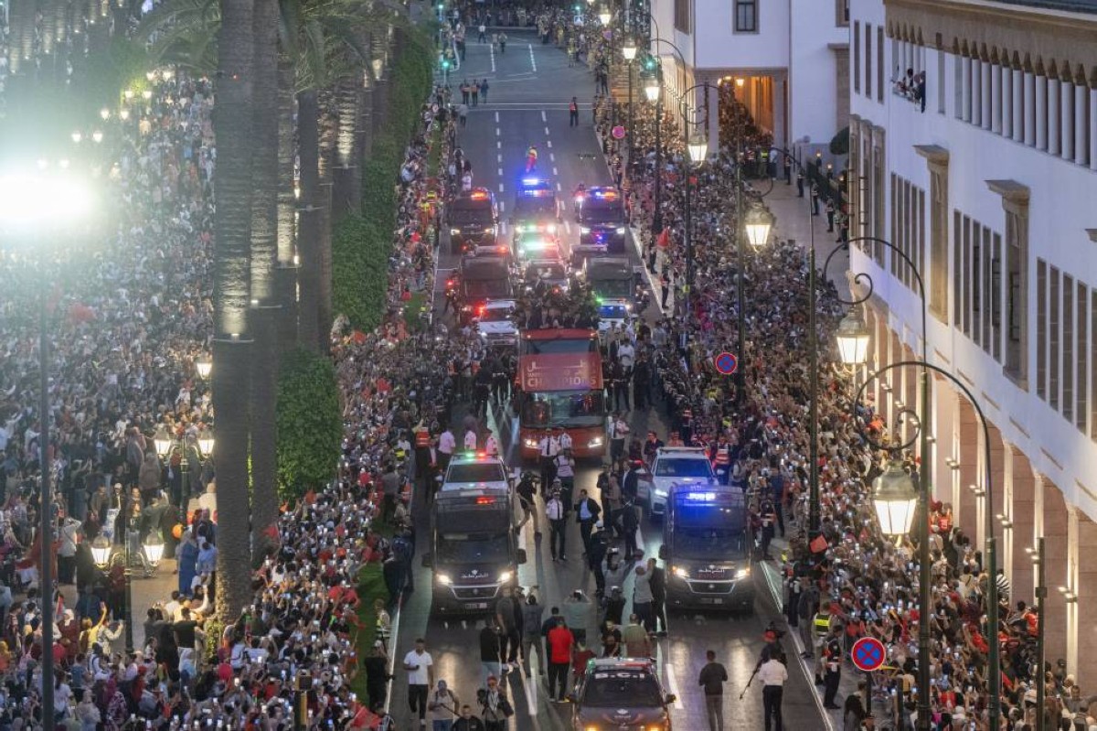 ولوّح لاعبو المنتخب ومدربهم محمد وهبي للجماهير التي قدمت من مختلف مدن البلاد، وأغلبها من الشبان الذين اصطفوا على طول جنبات شارع محمد الخامس في الرباط.