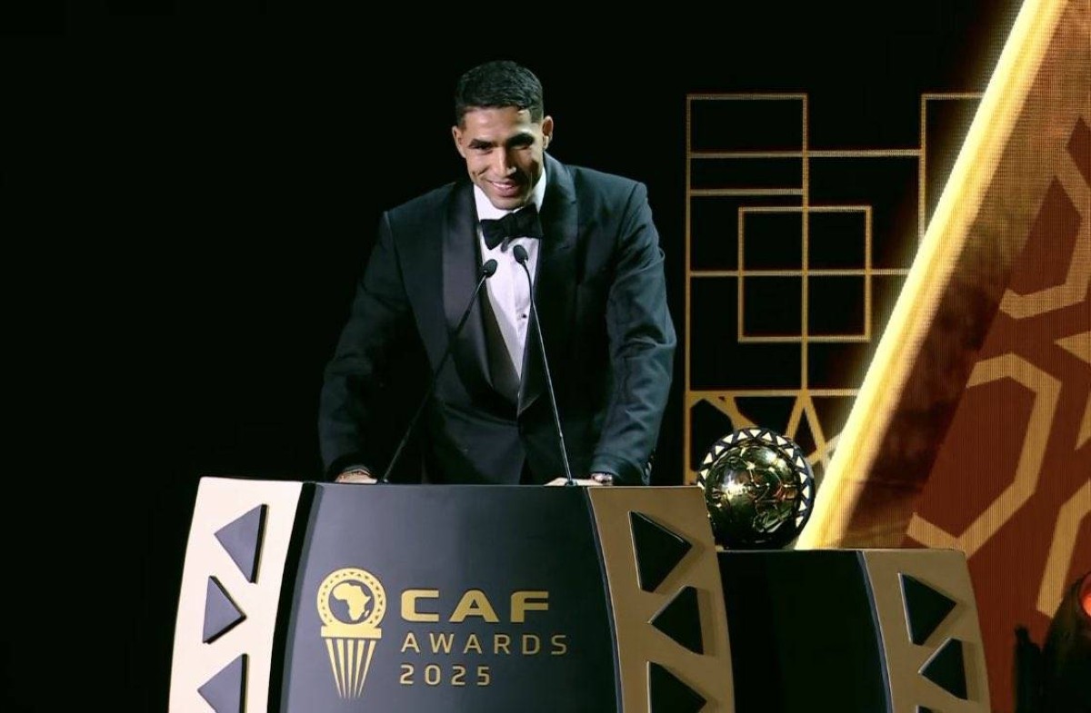 خطف المغربي أشرف حكيمي، نجم باريس سان جيرمان ومنتخب المغرب، الأضواء خلال تسلمه جائزة أفضل لاعب إفريقي لعام 2025 في مشهد أيقوني أثار تفاعل الجماهير والحاضرين.
