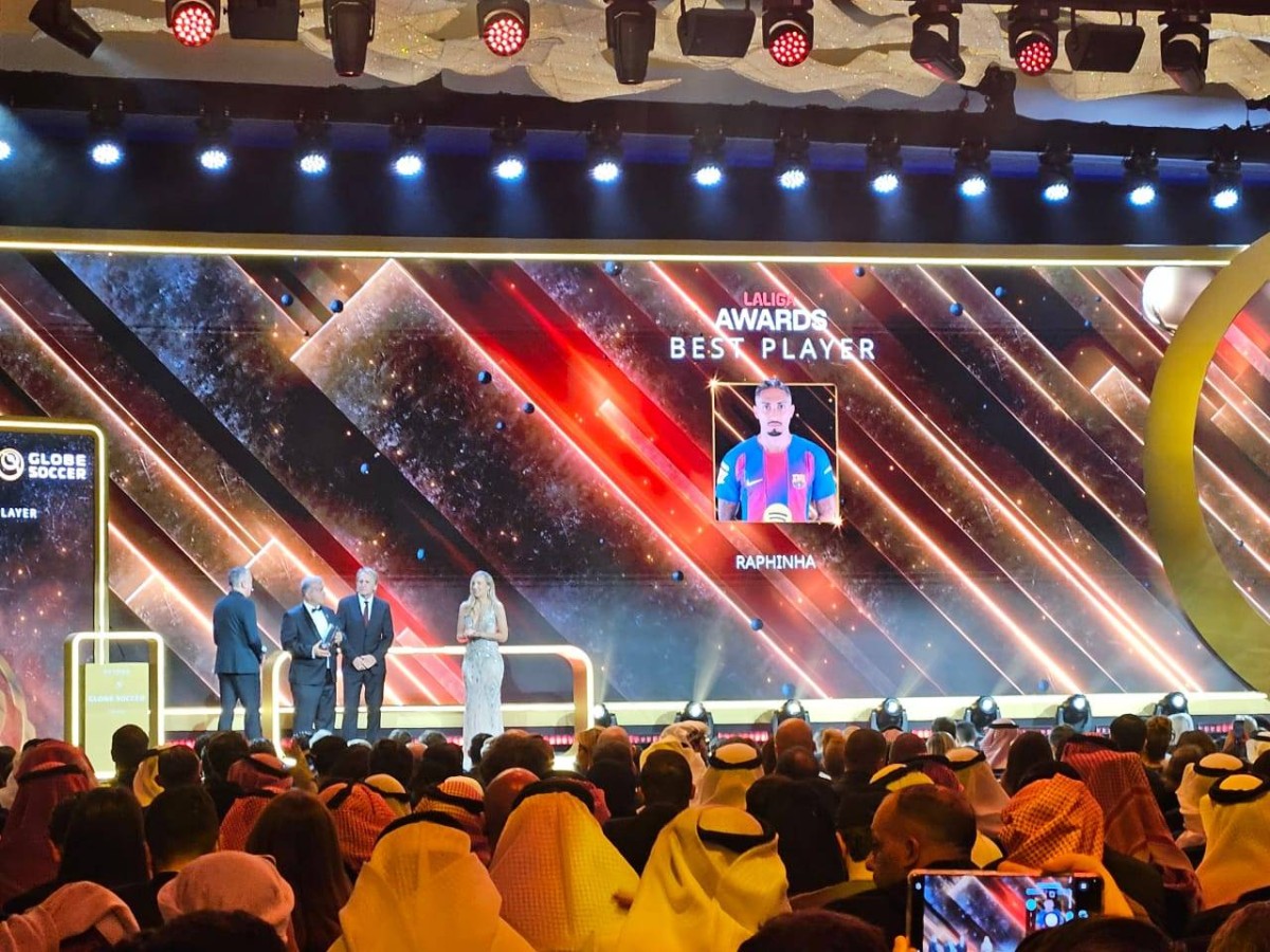 توج النجم البرازيلي رافائيل دياس بيلولي «رافينيا»، مهاجم نادي برشلونة، بجائزة أفضل لاعب في «الليغا» لموسم 2024-2025. وتسلم خوان لابورتا رئيس برشلونة الجائزة نيابة عن رافينيا خلال حفل لاليغا الذي أقيم على هامش حفل جوائز دبي غلوب سوكر مساء اليوم.