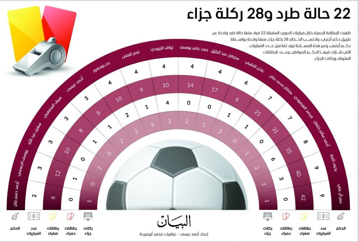 وتساوى الحكمان، عمر آل علي ويحي الملا، في إدارة أكثر عدد من المباريات، بواقع 9 مواجهات لكل منهما خلال 13 جولة من المنافسة، فيما يعد الحكم أحمد حسن الأقل مشاركة بإدارة مباراتين فقط في مشوار المنافسة حتى الآن.