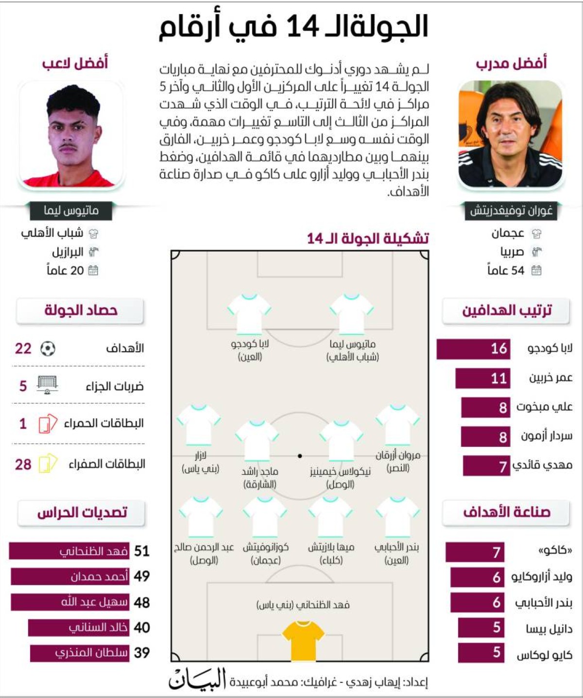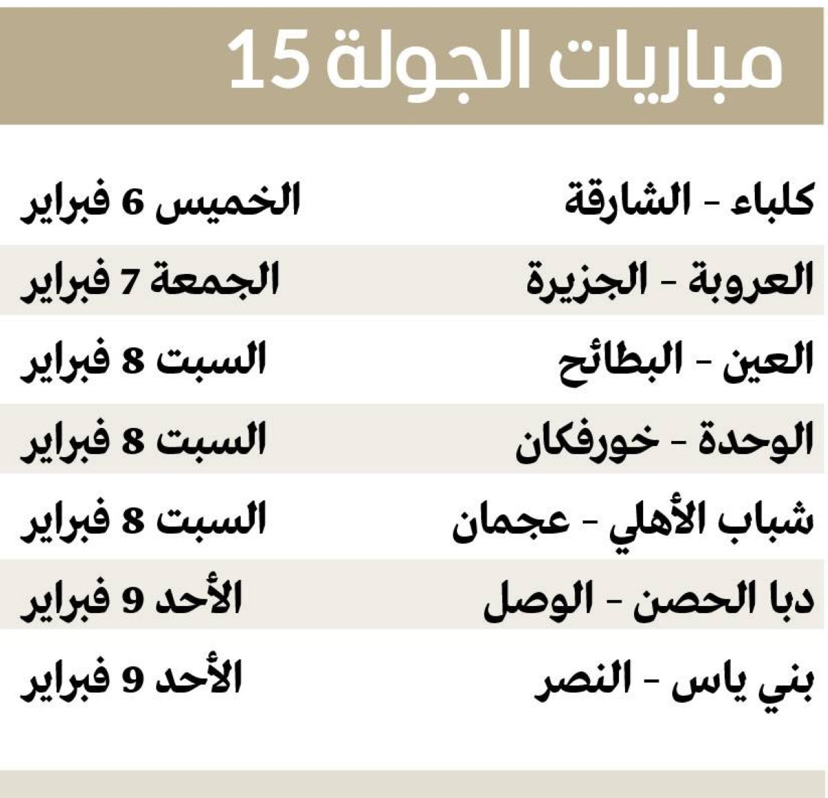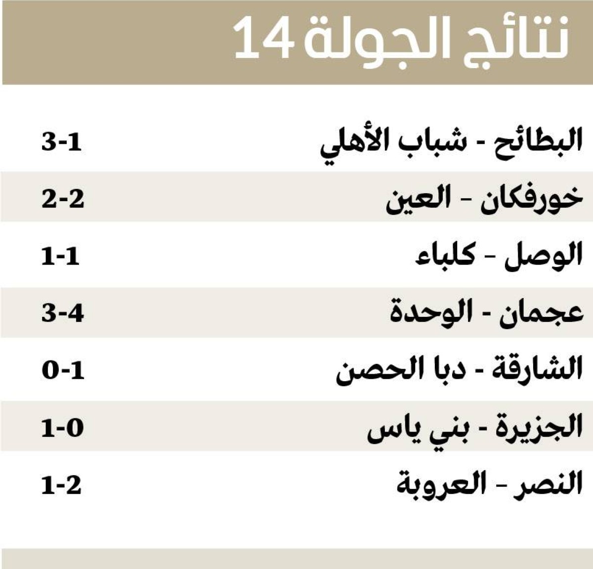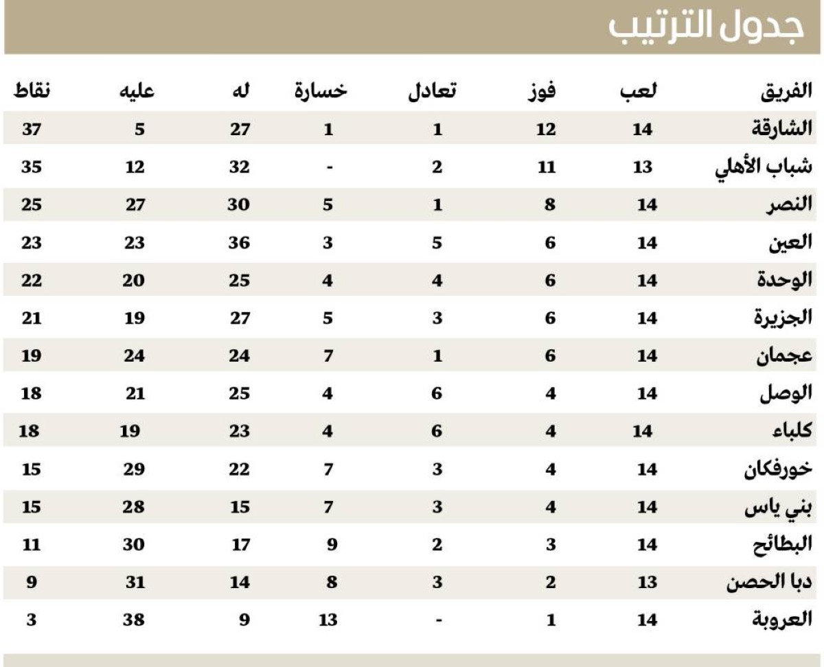 تجدر الإشارة إلى أن دوري أدنوك للمحترفين دخل مرحلة جديدة في رحلته المثيرة مع نهاية مواجهات الجولة 14، أولى جولات في الدور الثاني، مع ازدياد شراسة القتال على كل نقطة، وأسفرت نتائج الجولة عن محافظة الشارقة على الصدارة بتغلبه على ضيفه دبا الحصن بهدف دون مقابل، ووصوله إلى 37 نقطة، وتوقف رصيد دبا الحصن عند 9 نقاط بالمركز 13 قبل الأخير، وبقي شباب الأهلي بالمركز الثاني بفوزه على مضيفه البطائح (3 - 1)، ورفع رصيده للنقطة 35، وتوقف رصيد البطائح عند 11 نقطة بالمركز 12، وفاز النصر على ضيفه العروبة 2 - 1، ليرفع رصيده للنقطة 25، ويسترد المركز الثالث، وتوقف رصيد العروبة عند 3 نقاط بالمركز 14 الأخير، وتعادل العين مع مضيفه خورفكان 2-2، ورفع رصيده للنقطة 23، وتراجع للمركز الرابع، ووصل خورفكان للنقطة 15، وبقي في المركز العاشر، وحقق عجمان انتصاراً ثميناً على حساب ضيفه الوحدة 4 - 3، ورفع رصيده إلى 19 نقطة، وتقدم للمركز السابع، أما الوحدة فتجمد رصيده عند 22 نقطة، وتراجع إلى المركز الخامس، وفاز بني ياس على الجزيرة بهدف دون مقابل، ورفع رصيده إلى 15 نقطة بالمركز 11، وتوقف رصيد الجزيرة عند 21 نقطة، وبقي في المركز السادس، وتعادل الوصل وضيفه كلباء 1 - 1، ووصل كلا الفريقين للنقطة 18، وبقي الوصل في المركز السابع بأفضلية فارق الأهداف، أمام كلباء في المركز الثامن.