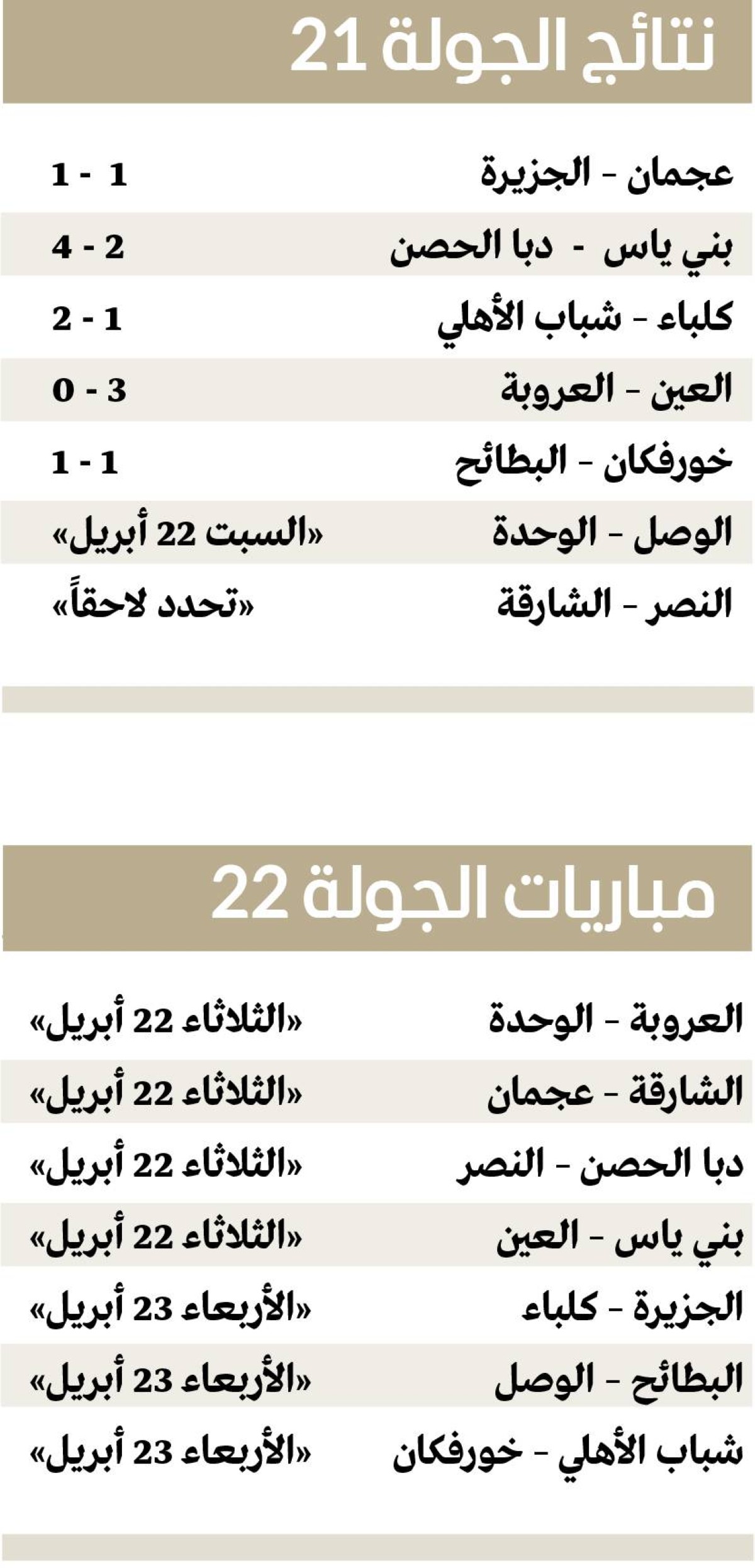 وفي بقية نتائج الجولة، كرر الوصل والوحدة نتيجة مباراتهما على ملعب إستاد آل نهيان بالدور الأول للدوري، بتعادلهما 2 - 2 مساء أول من أمس، ليظل الوحدة ثالثاً بوصوله إلى 36 نقطة، والوصل رابعاً بوصوله إلى 34 نقطة، وعاد العين للانتصارات بفوزه على ضيفه العروبة بثلاثية نظيفة، ليرفع رصيده للنقطة 33، في المركز الخامس، ويتجمد رصيد العروبة عند 6 نقاط في المركز 14 الأخير، ويتجدد أمله بالبقاء في عالم المحترفين، فيما تعادل الجزيرة ومضيفه عجمان 1 - 1، ورفع «فخر أبوظبي» رصيده للنقطة 31 في المركز السادس، ووصل عجمان للنقطة 27 في المركز التاسع.