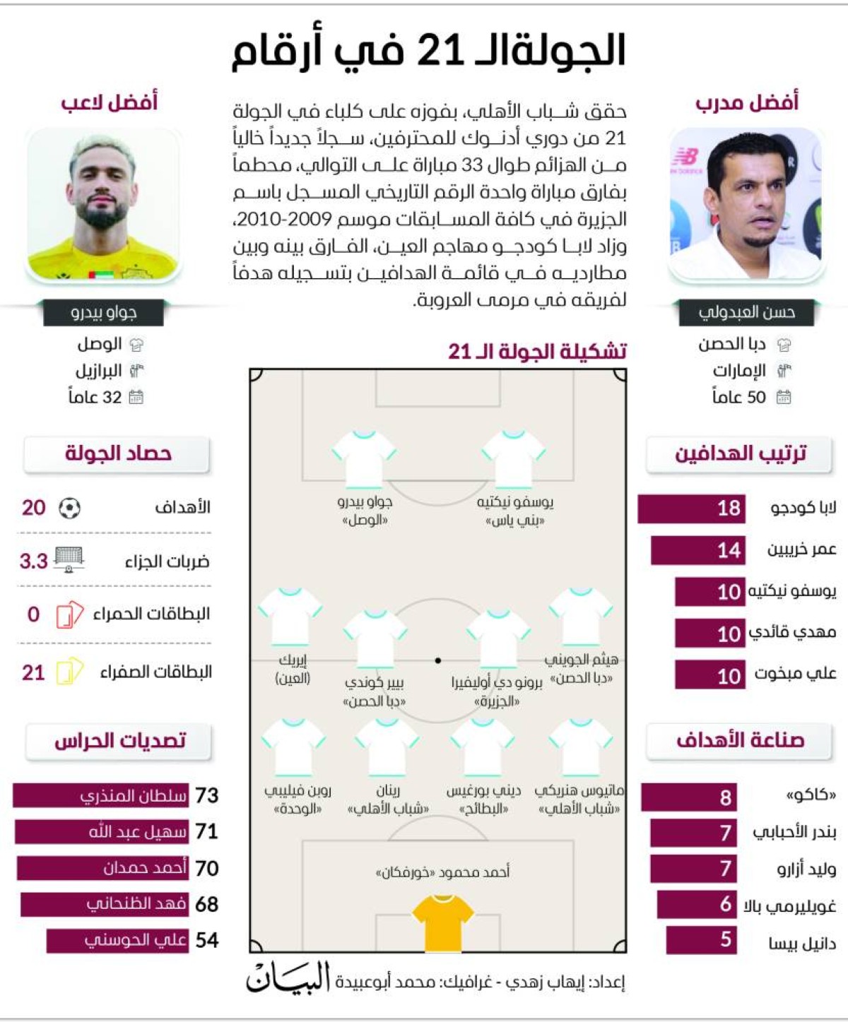 وأشاد رائد بما يقدمه المدربان الوطنيان عبد المجيد النمر مع خورفكان، وحسن العبدولي مع دبا الحصن، وأكد أن الناديين تأخرا كثيراً في التعاقد مع النمر والعبدولي، وقال إن موقع الناديين ربما سيكون أفضل إذا تم التعاقد مع هذين المدربين مبكراً، بناءً على الأرقام والنتائج المسجلة للفريقين تحت القيادة الفنية الوطنية، مشيراً إلى أن أبرزها عدم خسارة خورفكان في آخر 6 مباريات بالدوري، وفوز دبا الحصن على العين 3 - 2 في الجولة 19، والعودة بـ«ريمونتادا» وفوز مثير أمام بني ياس بنتيجة 4 - 2، وتوقع ارتفاع حرارة صراع النجاة من الهبوط خلال الجولات الخمس المتبقية من عمر الدوري، بعد نتائج الجولة 21.