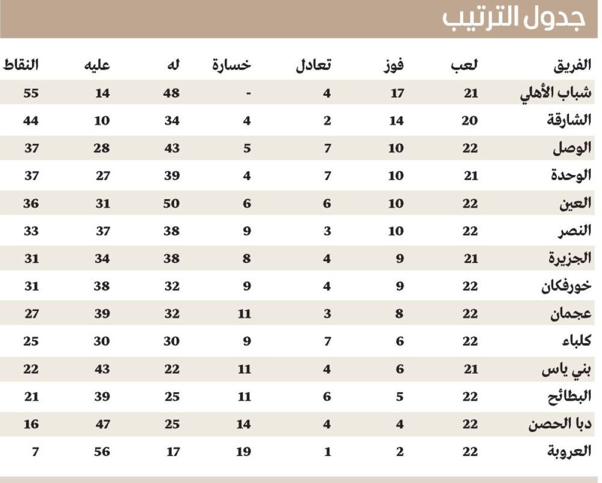 فيما يتجمد رصيد خورفكان عند النقطة 31 في المركز الثامن، كما عزز الشارقة مركزه الثاني، بفوزه على ضيفه برباعية نظيفة، ووصوله إلى 44 نقطة، بينما تراجع عجمان للمركز التاسع برصيد 27 نقطة.