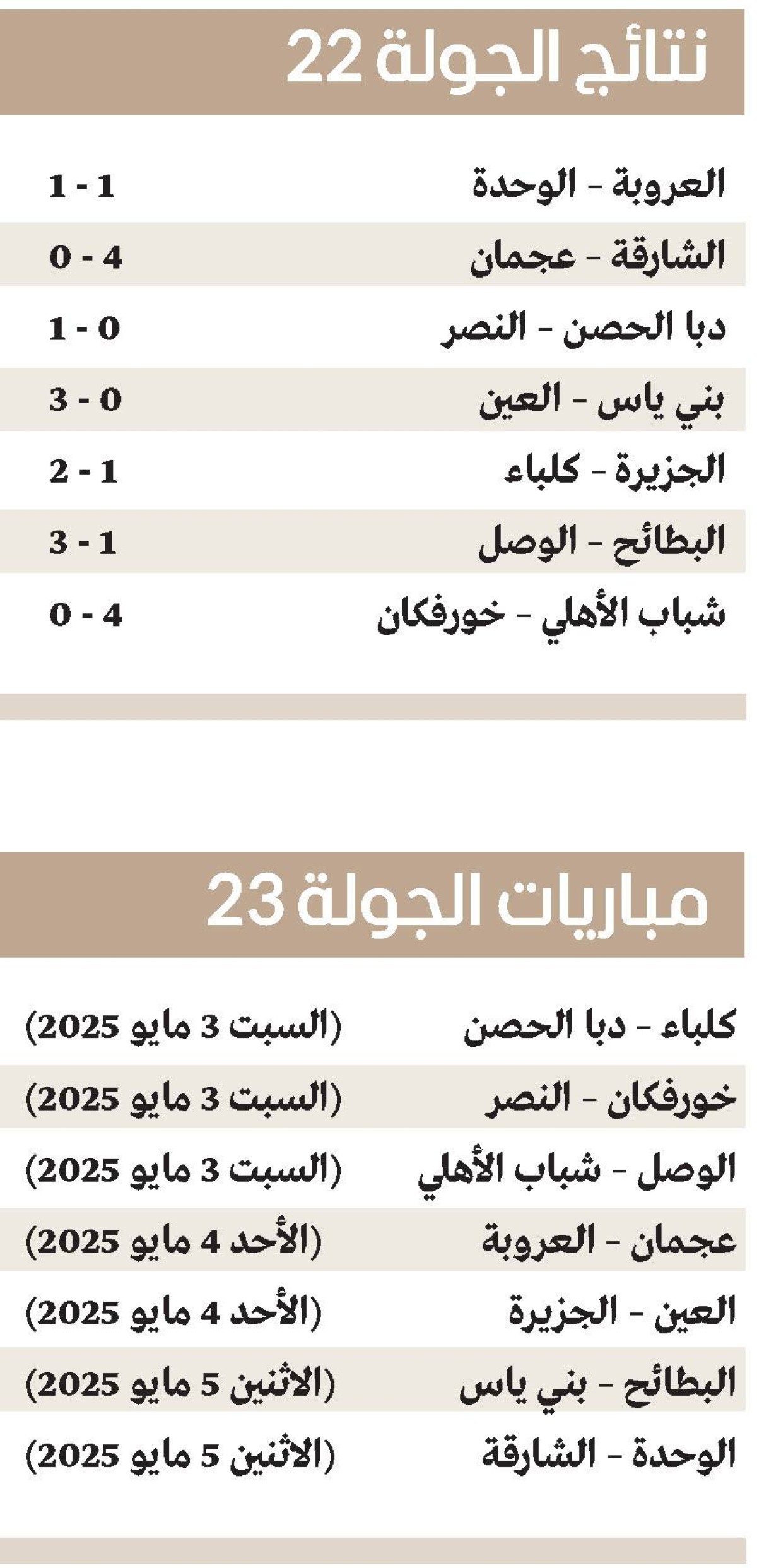 ولم يستفد البطائح بخسارته أمام ضيفه الوصل 1 - 3، من خسارة دبا الحصن أمام ضيفه النصر بهدف دون مقابل، ليبقى الصراع قائماً بين الفريقين للهروب من بطاقة الهبوط الثانية، بوجود دبا الحصن في المركز 13 قبل الأخير برصيد 16 نقطة، والبطائح في المركز 12 برصيد 21 نقطة.