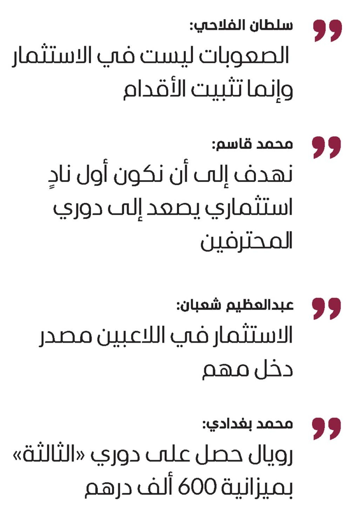 وهو أحد مصادر الدخل الاستثمارية المهمة في نادي يونايتد. لافتاً إلى أن عملية الاستثمار في اللاعبين إذا تمت وفق فكر احترافي سليم، قد تدر ما يقرب من 30 إلى 40 مليون درهم سنوياً.