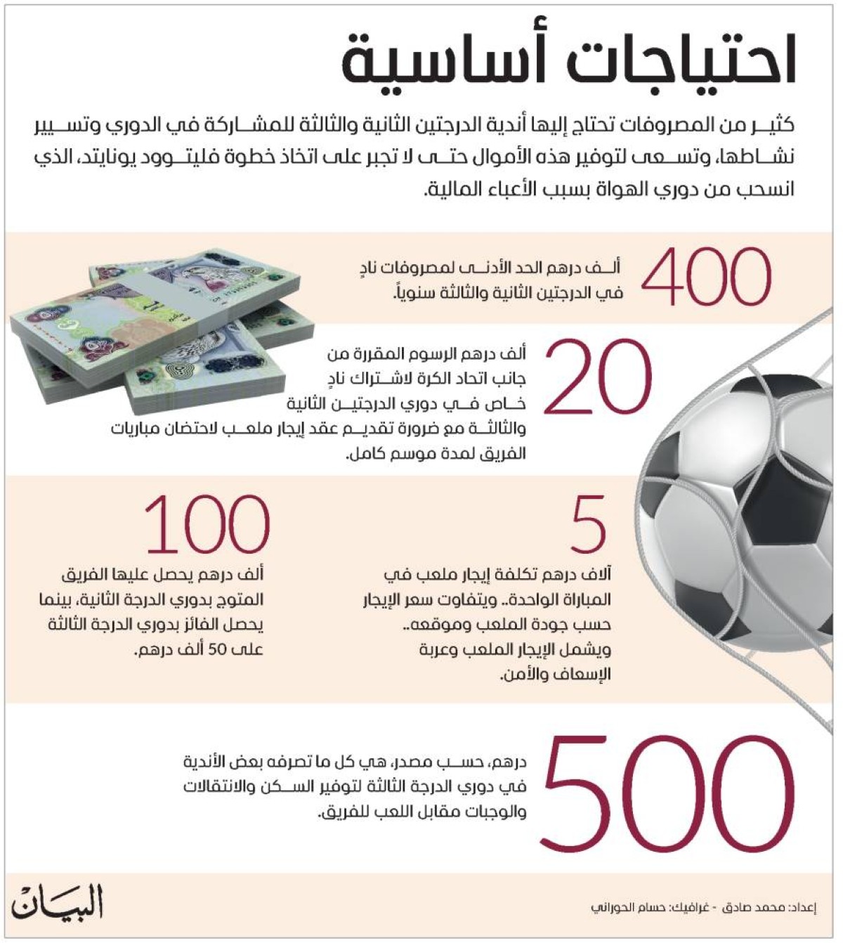 وتختلف ميزانية نادٍ خاص بحسب الدرجة، سواء الأولى أو الثانية أو الثالثة، وكنادٍ منافس عن غيره، وفقاً لملاك ومستثمرين في أندية خاصة، حيث تتراوح ما بين 300 إلى 400 ألف درهم كحد أدنى في الدرجتين الثانية والثالثة، وصولاً إلى مليون درهم، وما بين 2 مليون إلى نحو 30 أو 40 مليون درهم في دوري الدرجة الأولى.