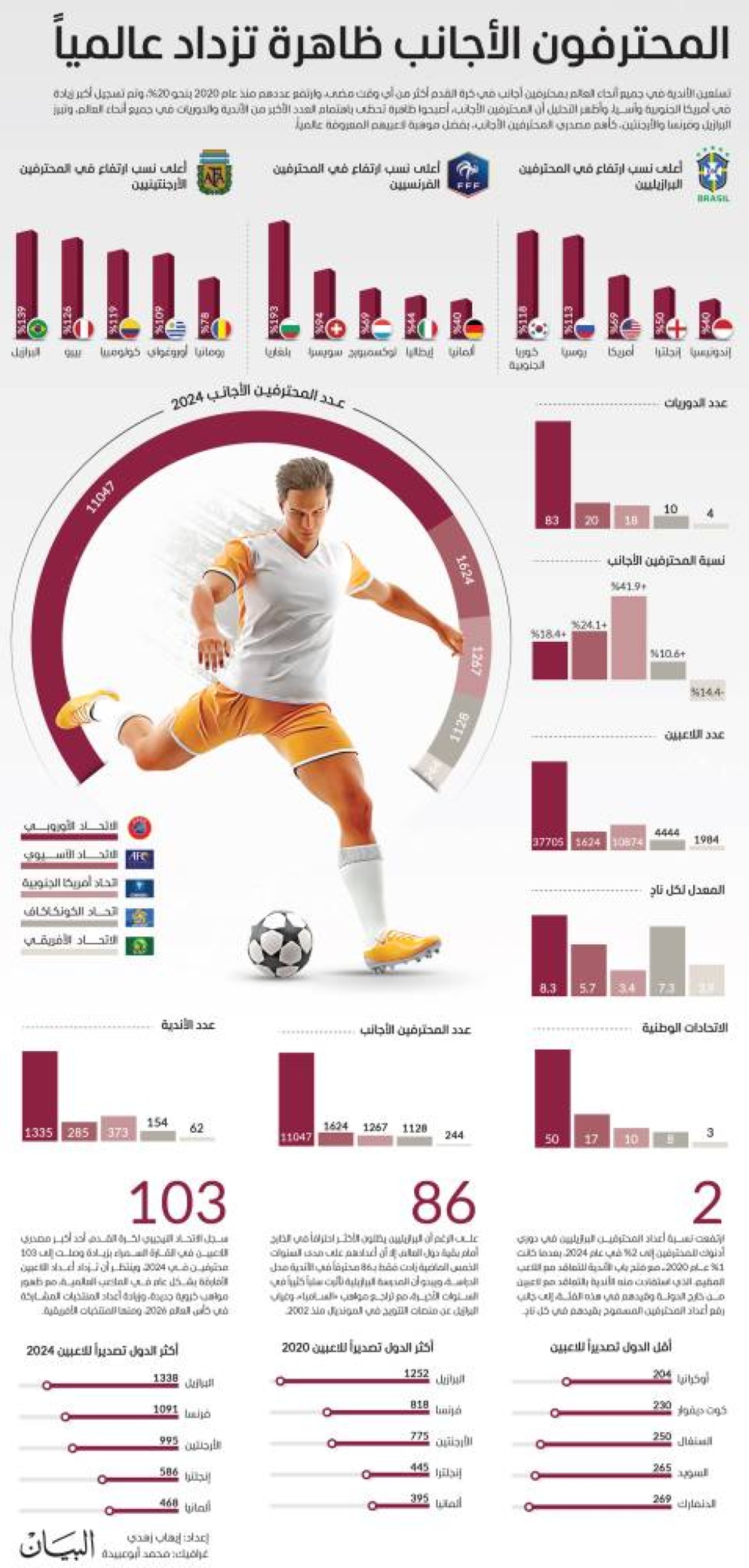 تمتلك فرنسا أكبر مجموعة من المحترفين الأجانب في 83 نادياً أوروبياً شملتها دراسة المرصد العالمي بواقع 946 لاعباً،، بينما تتصدر الأرجنتين دول أمريكا الجنوبية باحتراف 518 لاعباً في أندية تلك القارة، وتليها أوروغواي وكولومبيا التي تعتبر أيضاً المصدر الرئيسي لأندية أمريكا الشمالية والوسطى باحتراف 154 لاعباً في تلك الأندية، بينما تنافس البرازيل في آسيا باحتراف 410 من لاعبيها في الأندية الآسيوية التي شملتها الدراسة خلال الفترة من منتصف 2020 إلى منتصف 2024، ويتوقع أن تختلف الأعداد والنسب مع نهاية الموسم الحالي في منتصف عام 2025.