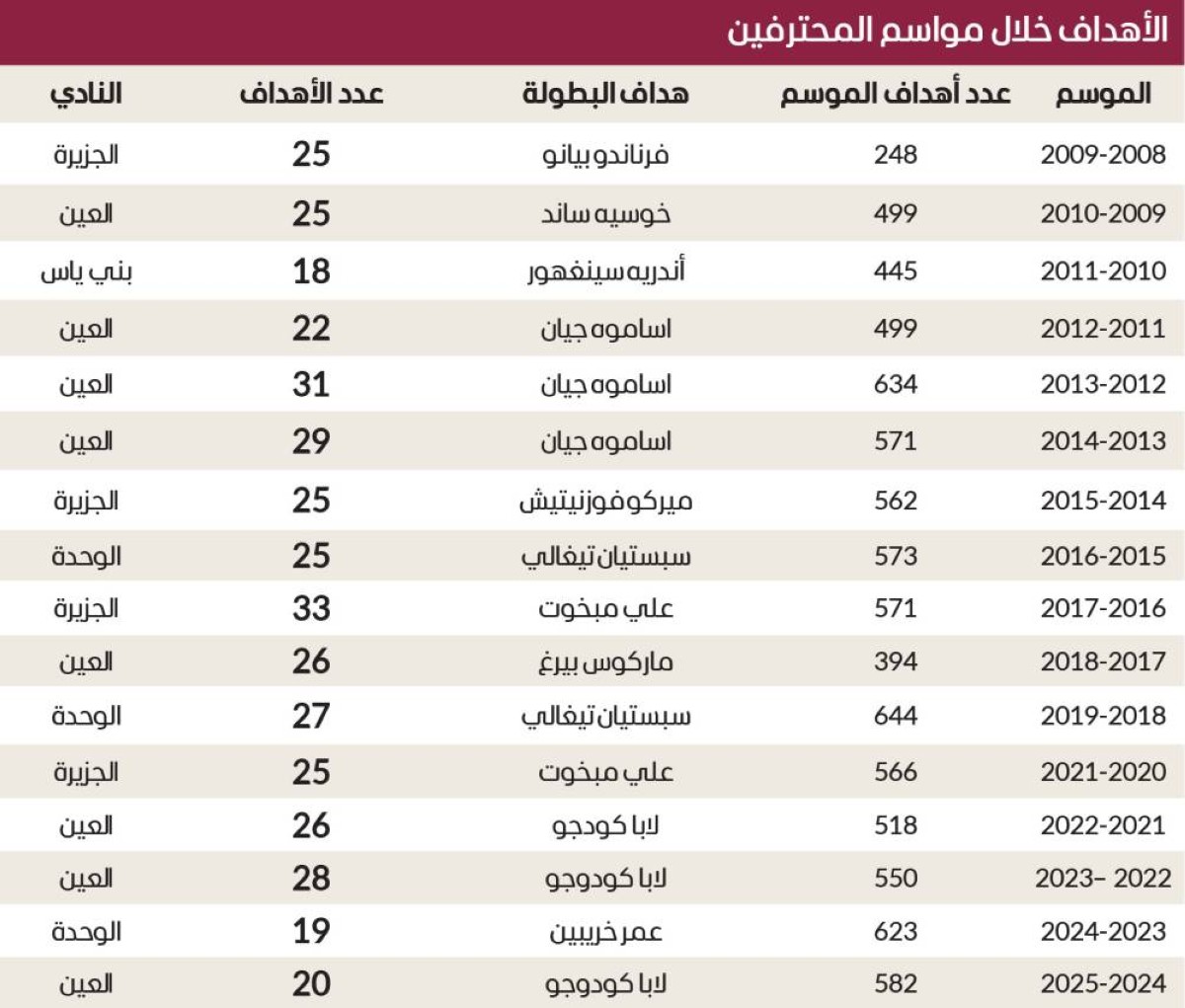 وصل إجمالي عدد الأهداف في مشوار دوري المحترفين الإماراتي إلى 8609 أهداف، أحرزها 20 نادياً خلال 16 نسخة سابقة بداية من موسم 2008 ـ 2009 التاريخي الذي شهد تحول كرة الإمارات من «الهواية» إلى «الاحتراف» وحتى الموسم السابق 2023 ـ 2024، فيما تتأهب الأندية لمواصلة كتابة التاريخ بنسخة جديدة تنطلق منتصف أغسطس المقبل.