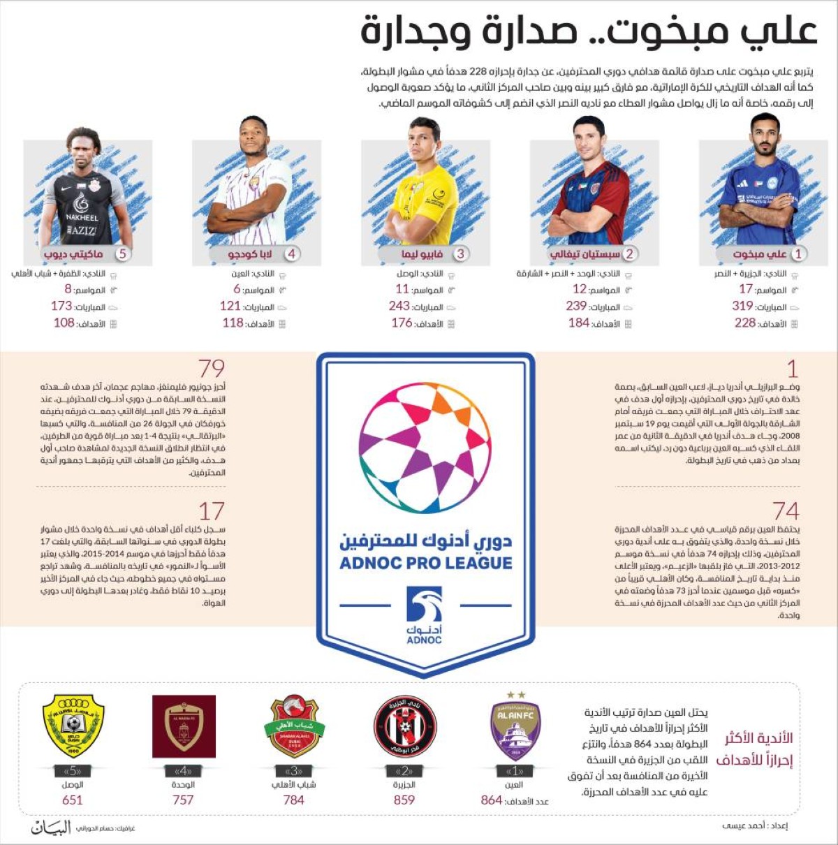 ويعتبر علي مبخوت مهاجم النصر الهداف التاريخي للدوري، صاحب أعلى معدل أهداف في نسخة واحدة، حيث أنه وبجانب صدارته لقائمة هدافي البطولة، يتربع على قائمة الأكثر إحرازاً للأهداف في نسخة واحدة بشعار ناديه السابق الجزيرة وبعدد 33 هدفاً منحته لقب هداف نسخة موسم 2016 ـ 2017 والذي قدم خلاله مستويات متميزة رفعت من أسهمه وسط جماهير ناديه في ذلك الوقت.