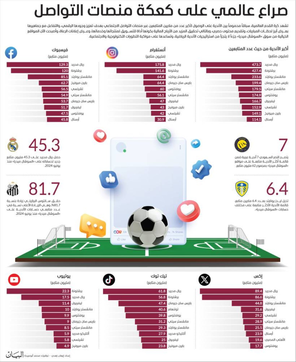 ومع تطور «السوشال ميديا»، أصبح لدى العديد من أنديتنا حسابات خاصة على الواتس اب، ويتابعها الآلاف من عشاق الكرة الإماراتية، وإلى جانب أندية دوري أدنوك للمحترفين، ويتابع رابطة المحترفين لكرة القدم، مليون و429.7 ألف متابع موزعين بين 218 ألفاً لمنصة إكس، و30 ألفاً للواتس آب، و7.9 آلاف لسناب شات، و641.8 ألفاً للتيك توك، و452 للانستغرام، و80 ألفاً للفيسبوك، بينما يتابع اتحاد الكرة الإماراتي 442.34 ألفاً موزعين بين 150 ألفاً لمنصة إكس، و289 ألفاً للانستغرام، و3.34 آلاف للفيسبوك.