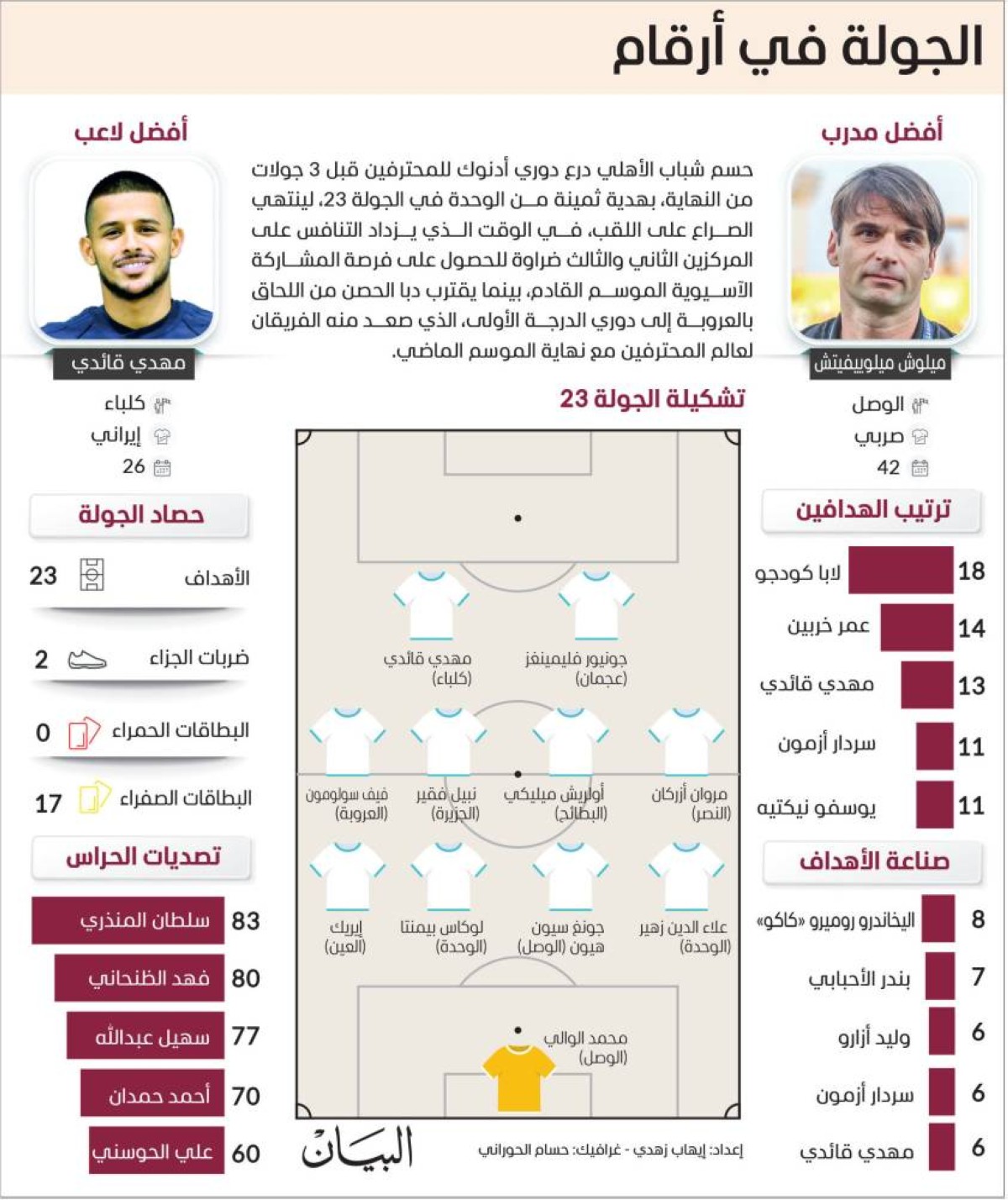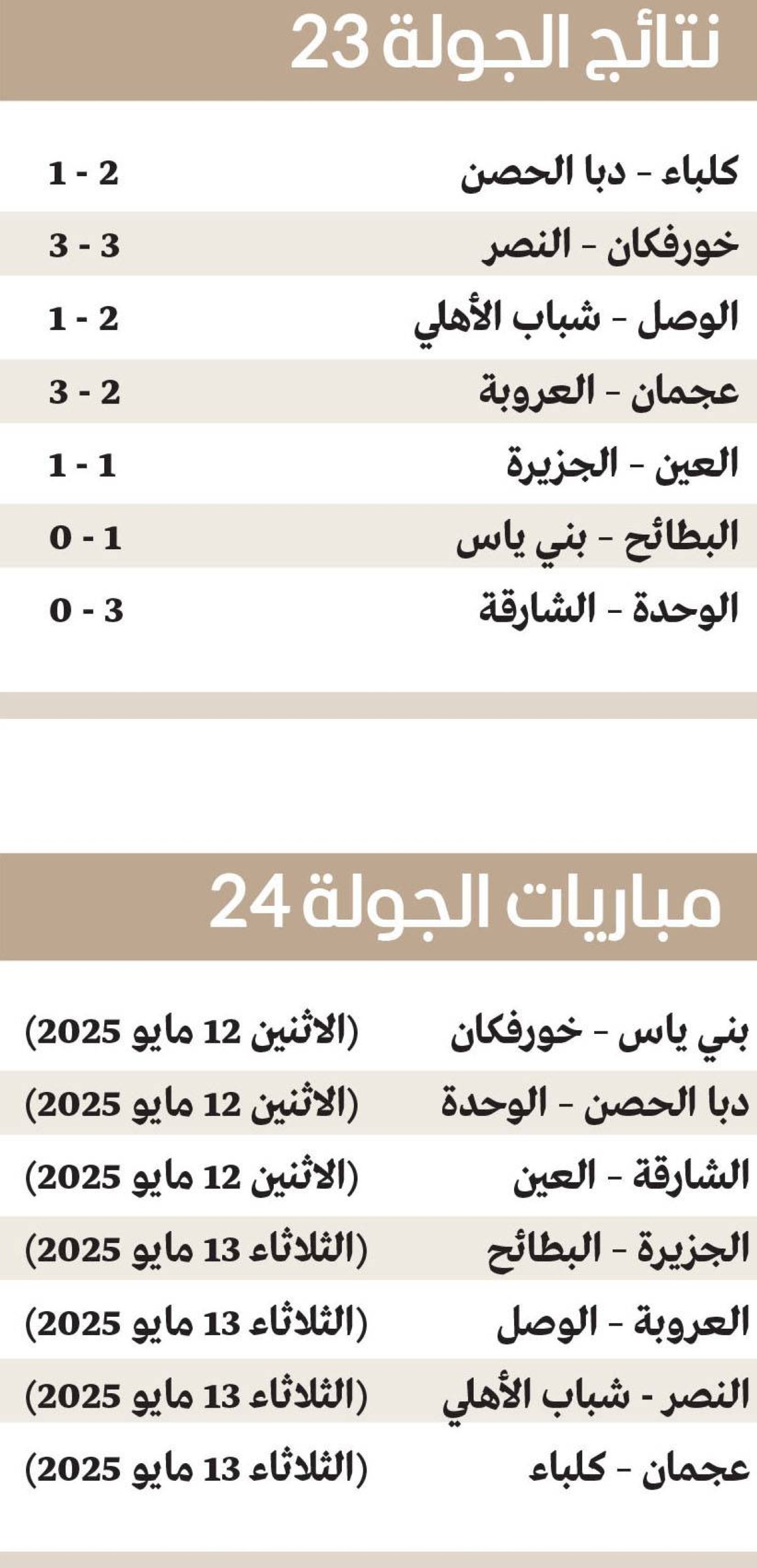 وكانت الجولة 23 قد شهدت خسارة شباب الأهلي أمام مضيفه الوصل 1 - 2، وهي الخسارة الأولى للفريق في دوري هذا الموسم، وجاءت في الوقت الذي كان يحتاج فيه الفريق لنقطة التعادل لحسم اللقب، الذي تحقق في اليوم الثاني للجولة، عندما خسر الشارقة أمام مضيفه الوحدة 0 ـ 3، ليتوقف رصيد «الفرسان» عند 56 نقطة في الصدارة، وتلاه الشارقة في المركز الثاني بفارق 11 نقطة، واستقر الوحدة في المركز الثالث بوصوله للنقطة 41، ورفع الوصل رصيده للنقطة 40 في المركز الرابع، ليشتعل الصراع بين الشارقة والوحدة والوصل، لإنهاء الموسم في المركزين الثاني والثالث، ويدخل معهما العين بأمل ضعيف بعد تعادله وضيفه الجزيرة 1 - 1، ليبقى في المركز الخامس برصيد 37 نقطة، وبفارق 4 نقاط عن الجزيرة الذي استقر في المركز السابع.