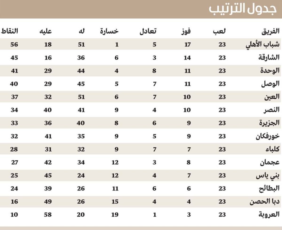 وأضاف أن الشارقة لم يكن يملك أدوات «النفس الطويل» للمنافسة على درع الدوري، ووضح هذا الأمر بعد تعادله السلبي مع شباب الأهلي في الجولة 19، إذ بدأ بعدها مدربه الروماني أولاريو كوزمين، في التركيز أكثر على بطولتي كأس صاحب السمو رئيس الدولة، ودوري أبطال آسيا، ونجح بالفعل في التأهل لنهائي البطولتين يومي 9 و18 مايو الجاري، وهو ما أفقد الفريق الكثير من النقاط في الدور الثاني لدوري أدنوك للمحترفين، ونتمنى للفريق التوفيق بالعودة من أمام ليون سيتي السنغافوري بكأس البطولة الآسيوية، وبالتوفيق لكوزمين بعدها في مهمته مع منتخبنا الوطني الأول، والوصول بـ«الأبيض» لنهائيات كأس العالم 2026.