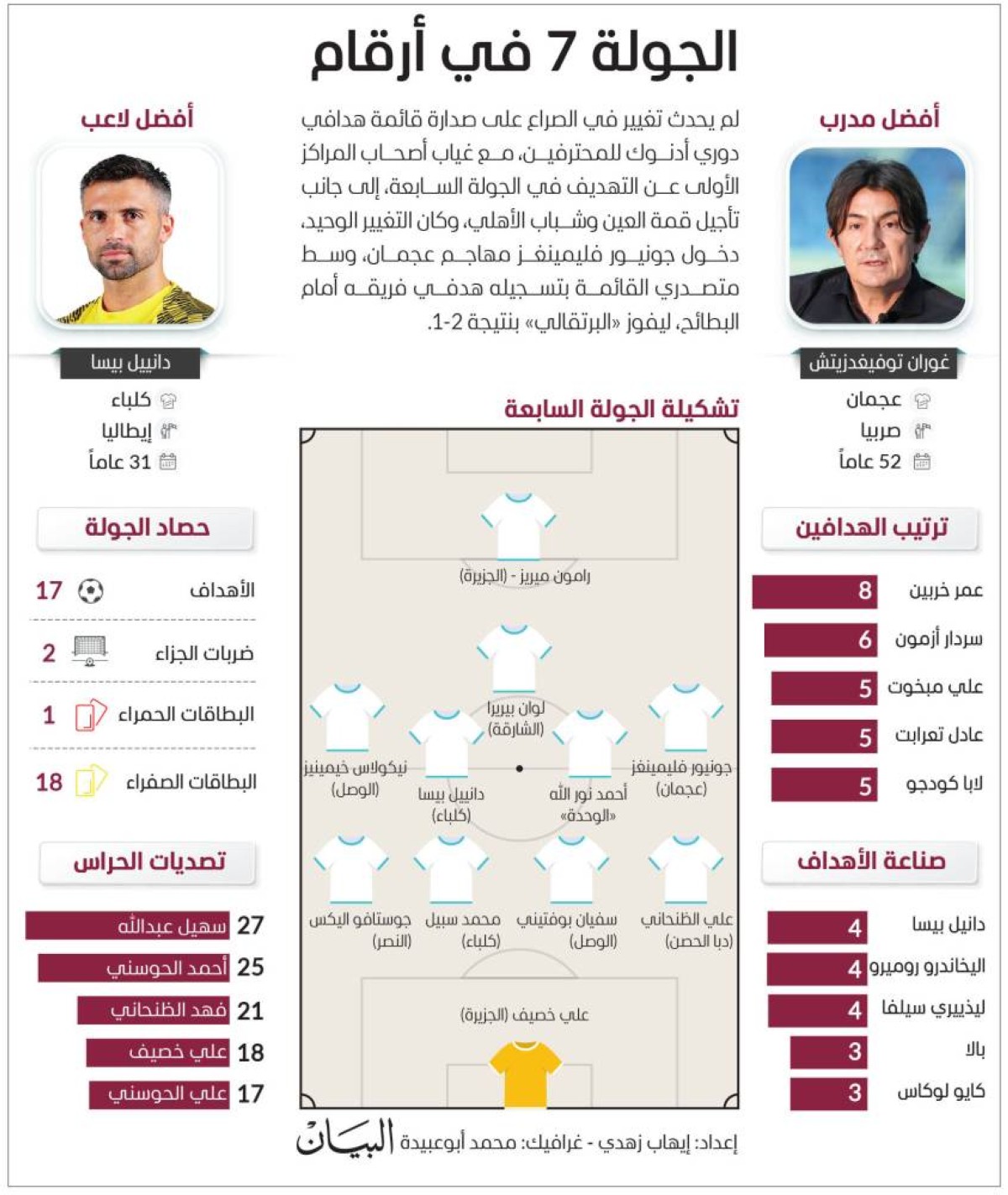 وتعادل النصر وضيفه الوحدة سلبياً في القمة الأولى بالجولة، ورفع الوحدة رصيده إلى 14 نقطة في المركز الثالث، وتراجع النصر إلى المركز الخامس برصيد 13 نقطة، بينما حسم التعادل الإيجابي 2-2، القمة الثانية، وجمعت الوصل وضيفه الجزيرة، ليضيف كل فريق نقطة لرصيده، ويصل الوصل للنقطة 9 بالمركز السابع، والجزيرة للنقطة 13 بالمركز الرابع، وتواصل الأندية الأربعة نزيف النقاط في النسخة الحالية من الدوري، فيما أصبح الجزيرة أكثر من سجل أهدافاً في أول 10 دقائق من مباريات الدوري هذا الموسم، بتسجيل 4 أهداف، وسجل هاريس سيفيروفيش مهاجم الوصل، للمرة الأولى في مرمى الجزيرة، وكذلك كان هدف زميله جوناتاس سانتوس، الأول للوصل في الشوط الثاني، منذ هدفه أمام النصر في الجولة الثالثة.