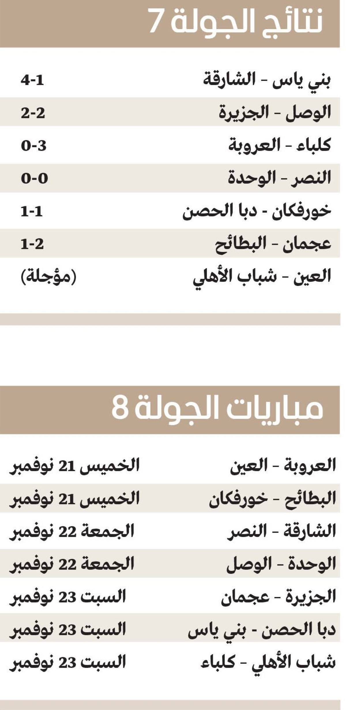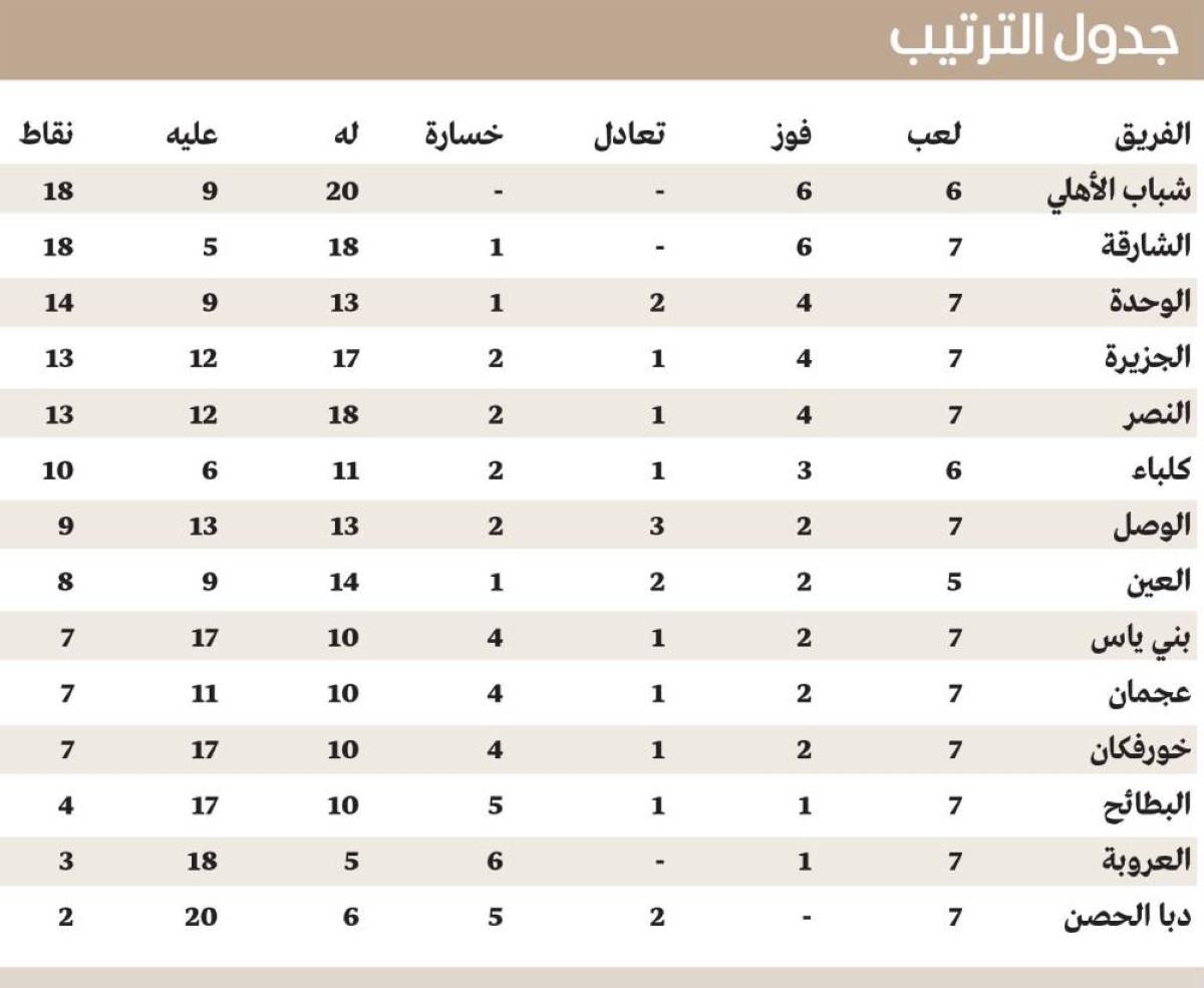 وفاز كلباء على ضيفه العروبة 3 - 0، ورفع رصيده للنقطة 10، وصعد إلى المركز السادس، وتوقف رصيد العروبة عند 3 نقاط، وظل في المركز 13 قبل الأخير، وصنع دانييل بيسا لاعب كلباء، 4 أهداف لزميله مهدي قائدي، والذي صنع بدوره 3 أهداف لبيسا منذ بداية الموسم الماضي، في حين، تعادل خورفكان مع ضيفه دبا الحصن 1-1، ورفع خورفكان رصيده إلى 7 نقاط في المركز 11، فيما وصل دبا الحصن إلى النقطة الثانية، وبقي في المركز 14 الأخير، وحقق عجمان انتصاراً ثميناً على ضيفه البطائح 2 - 1، ورفع رصيده إلى 7 نقاط، وتقدم إلى المركز العاشر، وتجمد رصيد البطائح عند 4 نقاط، واستقر في المركز 12.