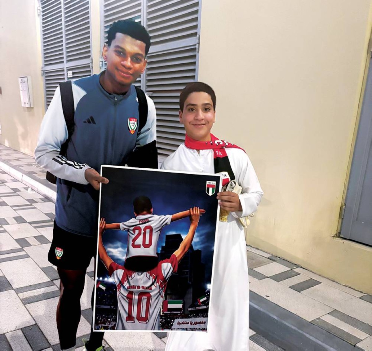 وحرص المشجع الصغير، خلف السويدي، على إهداء الغساني عقب اللقاء، لوحة عليها صورة رمزية لأسطورة ونجم المنتخب الوطني السابق، عدنان الطلياني، وهو يحمل على كتفيه طفلاً يرتدي قميص الغساني برقمه مع المنتخب، في إشارة إلى أنه يحمل آمال «الأبيض» في تصفيات المونديال، إذ كان قد نشر الصورة حساب اتحاد الإمارات لكرة القدم على مواقع التواصل الاجتماعي قبل مباراة قطر، وحرص المشجع على طباعتها وإهدائها إلى الغساني عقب اللقاء.