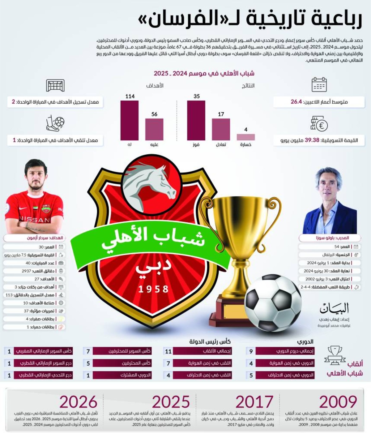 وخلال مشوار «الفرسان» في الموسم المنتهي، لم يخسر الفريق سوى 4 مباريات، والأولى كانت بهدف دون مقابل أمام الغرافة القطري في الدور التمهيدي الثاني من دوري أبطال آسيا للنخبة، والثانية أمام ناساف الأوزبكي 1 - 2، في الجولة الثانية للمجموعة الرابعة من دوري أبطال آسيا، والخسارة الثالثة أمام الوصل بالنتيجة نفسها ضمن الجولة 23 من دوري أدنوك للمحترفين، وكانت الخسارة الرابعة أمام الجزيرة في نهائي كأس مصرف أبوظبي الإسلامي.