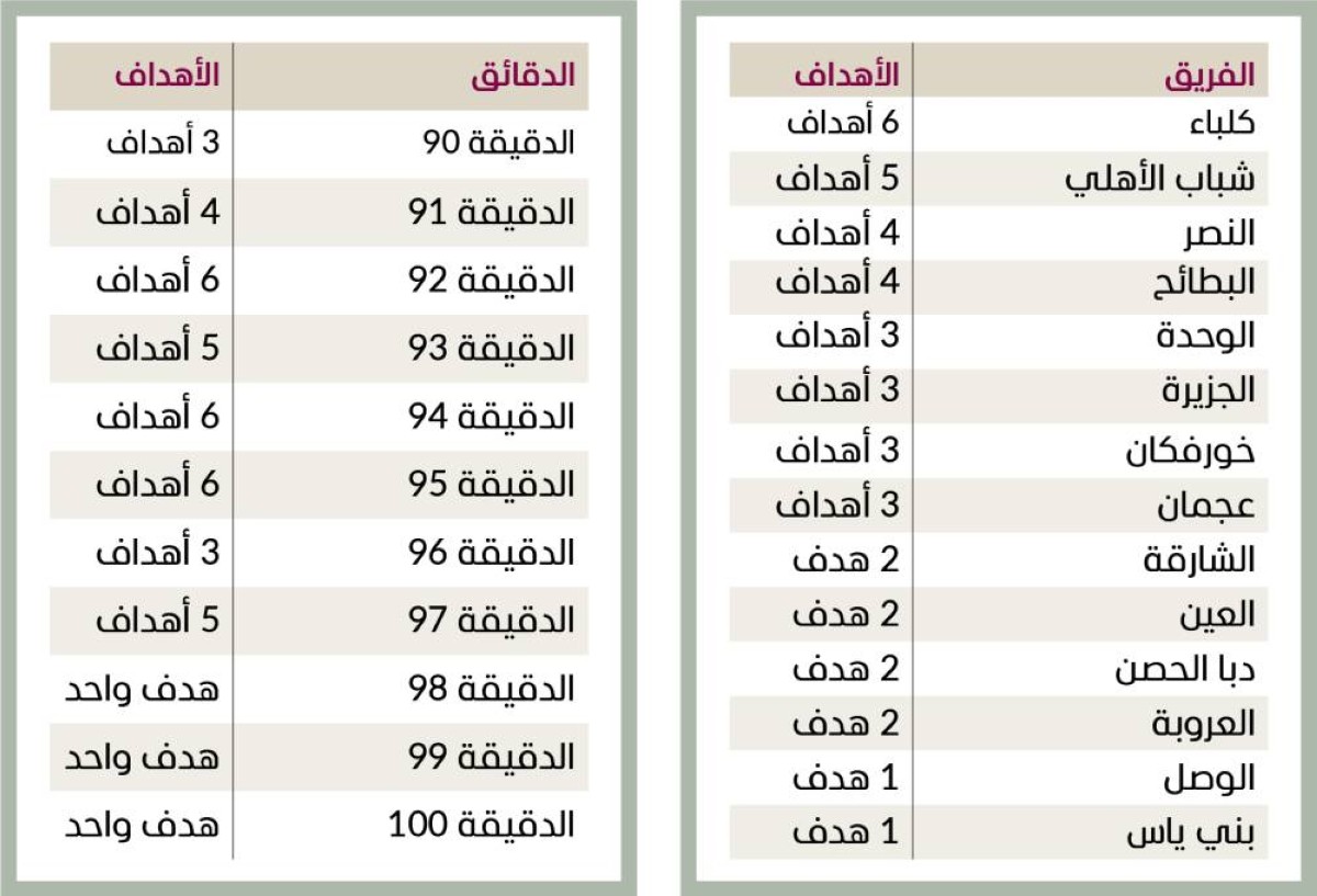 وجاء نادي كلباء في صدارة الأندية المسجلة لأهداف «بلس 90» هذا الموسم، وحتى الجولة الماضية، إذ شهدت مباريات النمور تسجيل 6 أهداف بعد الدقيقة 90، يليه شباب الأهلي ثانياً بـ 5 أهداف، ثم النصر والبطائح بـ 4 أهداف، والوحدة والجزيرة وخورفكان وعجمان بـ 3 أهداف، والشارقة والعين ودبا الحصن والعروبة بهدفين، بينما يعد الوصل وبني ياس هما أقل الفرق تسجيلاً للأهداف القاتلة، بهدف واحد فقط.