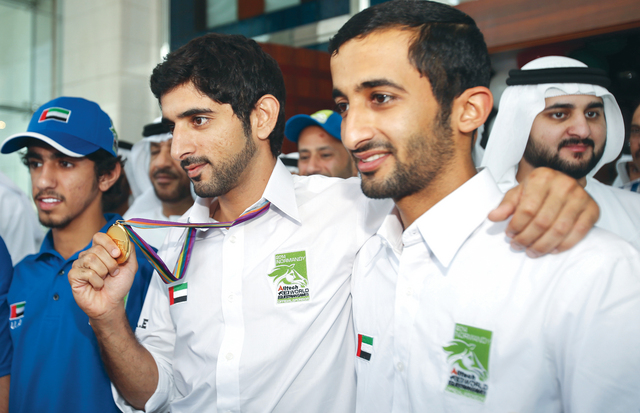 جاء ذلك بعد عودة سموه إلى الدولة صباح أمس، بحفظ الله ورعايته، متوَّجاً بذهب البطولة، بعد انتزاعه لقب ذهبية الفردي في السباق الذي أقيم في مقاطعة نورماندي الفرنسية، ضمن بطولة العالم لألعاب الفروسية نورماندي 2014، بمشاركة 173 فارساً وفارسة، يمثلون 47 دولة من مختلف أنحاء العالم، وأكد سموه أن الإمارات هي التي تُوجت ببطولة العالم للقدرة، وأن الإنجاز يُحسب للدولة في المقام الأول.