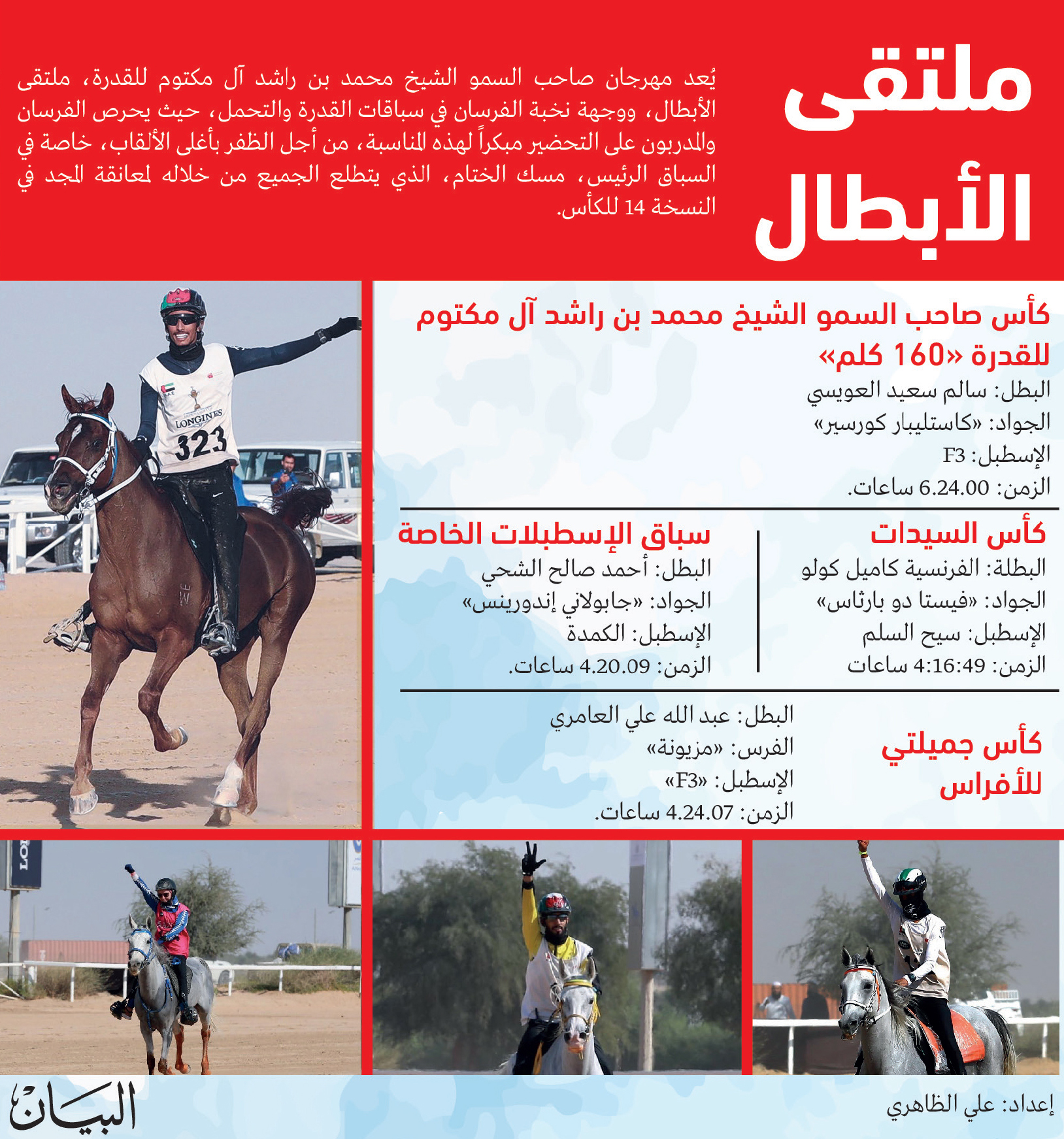 وتحتضن مدينة دبي الدولية للقدرة فعاليات الحدث المرموق بتنظيم نادي دبي للفروسية وبالتعاون مع اتحاد الفروسية، وبمشاركة أبرز الحكام والبيطريين المختصين بسباقات القدرة والتحمل. ونال الفارس سمو الشيخ حمدان بن محمد بن راشد آل مكتوم ولي عهد دبي، بطل العالم في نورماندي عام 2014، شرف الفوز بالسباق الرئيس لأكثر من نسخة، بينما يعد الفارس سالم سعيد العويسي هو بطل النسخة الماضية على صهوة «كاستليبار كورسير» لاسطبلات F3 محققاً اللقب في السباق الذي شهد مشاركة 239 مشاركاً ينتمون إلى 33 دولة ويمثلون 68 اسطبلاً.