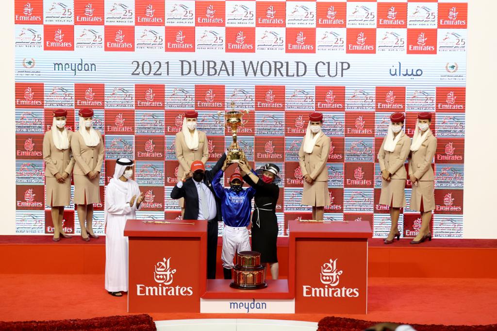 فقد سلم الشيخ جمعة آل مكتوم الكأس الذهبية للمدرب والجوكي الذي قاد الحصان وتعود ملكيته إلى جودلفين الإمارات والذي حصل كذلك على الجائزة المالية البالغة نحو ستة ملايين و ستمائة ألف دولار أمريكي مقدمة من طيران الإمارات راعية الشوط الرئيسي الذي ناهز مجموع جوائزه النقدية 12 مليون دولار أميركي موزعة على الفائزين الثمانية الأوائل.