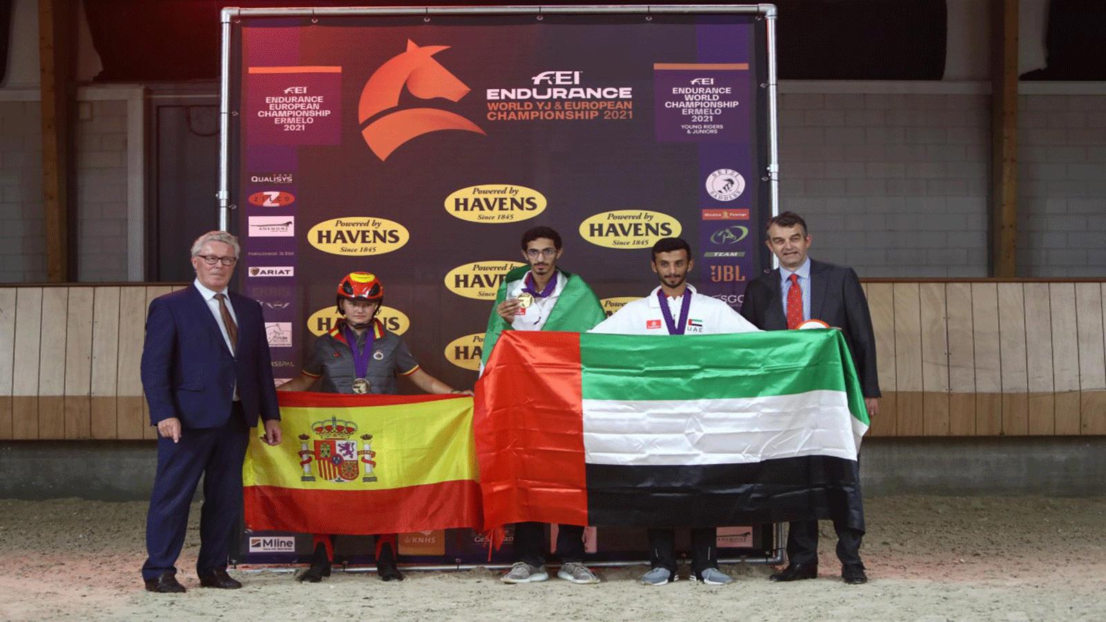 خطف فرسان الإمارات الأضواء في حفل تتويج أبطال مونديال الشباب والناشئين للقدرة والتي احتضنتها مدينة إرميلو في مملكة هولندا لمسافة 120 كلم أمس بمشاركة نحو 75 فارساً وفارسة من 22 دولة، واتجهت الأنظار إلى فرساننا على منصة التتويج بعد تكرار نفس المشهد السابق الذي شهده العالم قبل نحو 4 أشهر بتتويجهم بالميداليتين الذهبية والفضية في بطولة العالم للكبار بمدينة بيزا الايطالية.