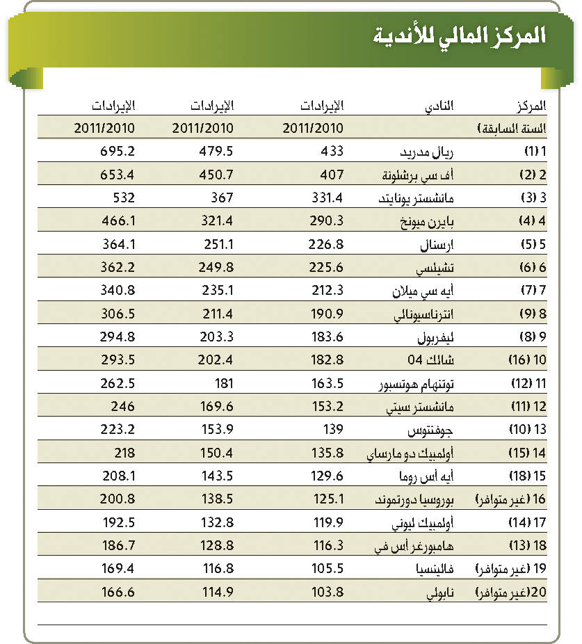 أفادت مجموعة الأعمال الرياضية في "ديلويت" أن استثمارات الشرق الأوسط في كرة القدم الأوروبية قد تزامنت مع مستويات قياسية للعائدات. وقد أشار التقرير السنوي لشركة ديلويت للاستشارات عن الشؤون المالية في كرة القدم إلى ارتفاع مجموع عائدات أهم 20 نادي كرة قدم لناحية الإيرادات بنسبة 3 % سنوياً خلال موسم 2010/2011، لتتخطّى عتبة الستة مليارات، ويعود ذلك جزئياً إلى حركة الاستثمارات من منطقة الشرق الأوسط.