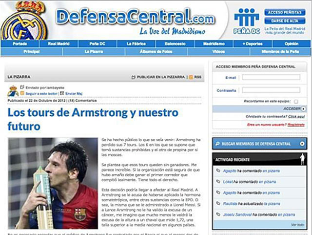وجّهت صحيفة "الديفنسا سنترال" الإسبانية، ذات الميول المدريدية، انتقادات لاذعة لنجم نادي برشلونة واللاعب الأفضل بالعالم الدولي الأرجنتيني ليونيل ميسي متهمة إياه، وكذلك رفاقه بالنادي الكاتالوني، بتعاطي المنشطات.