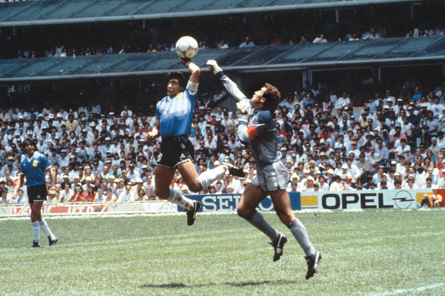 توج المنتخب الأرجنتيني عام 1986 بلقب المونديال الذي أقيم في المكسيك ولكن هذا الإنجاز لم يكن مستحقاً ونزيهاً لأن وصول التانغو إلى نصف النهائي كان مزوراً وغير شرعي، حيث تحقق على إثر هدف أحرزه الأسطورة دييغو مارادونا بيده في مرمى انجلترا مخادعاً الحكم التونسي علي بالناصر.