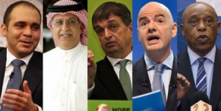 اكد الاتحاد الدولي لكرة القدم اليوم الثلاثاء في زيوريخ رسميا ترشيح الخماسي، البحريني الشيخ سلمان بن ابراهيم آل خليفة، والاردني الامير علي بن الحسين، والسويسري جاني إنفانتينو، والجنوب افريقي طوكيو سيكسويل، والفرنسي جيروم شامبانيي الى الانتخابات الرئاسية.