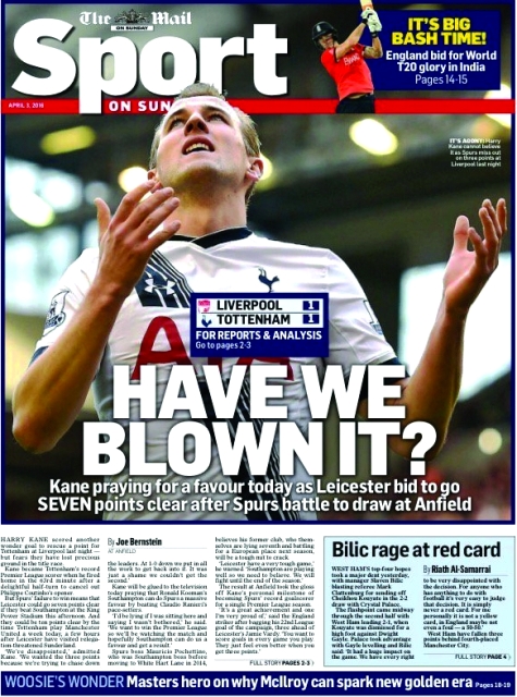 وعنونت صحيفة «ذا ميل» على صدر صفحتها الأولى «هل أفسدنا الأمر؟» وقالت الصحيفة، إن هاري كين الذي أنقذ الفريق من الخسارة أمام ليفربول يتمنى تعثر المتصدر ليستر سيتي حتى يبقي على آمال توتنهام في المنافسة على لقب الدوري الإنجليزي الممتاز.