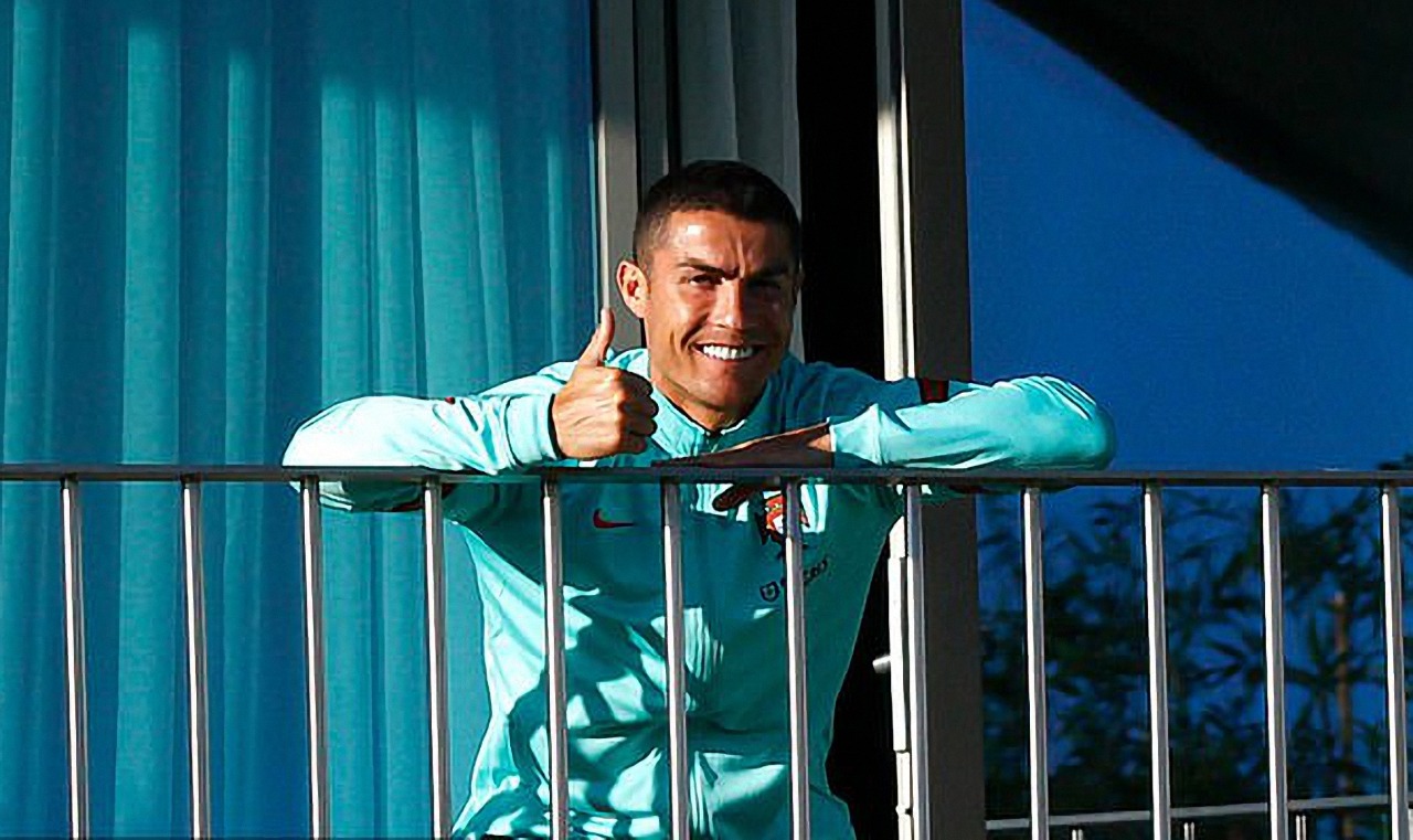 ولكن رونالدو ابتسم للكاميرات، وأشار بإبهامه لأعلى وهو يشاهد زملائه، وهم يتدربون من شرفة غرفته في مجمع الفريق، بعد أن أكد الاتحاد البرتغالي لكرة القدم اختباره الإيجابي.