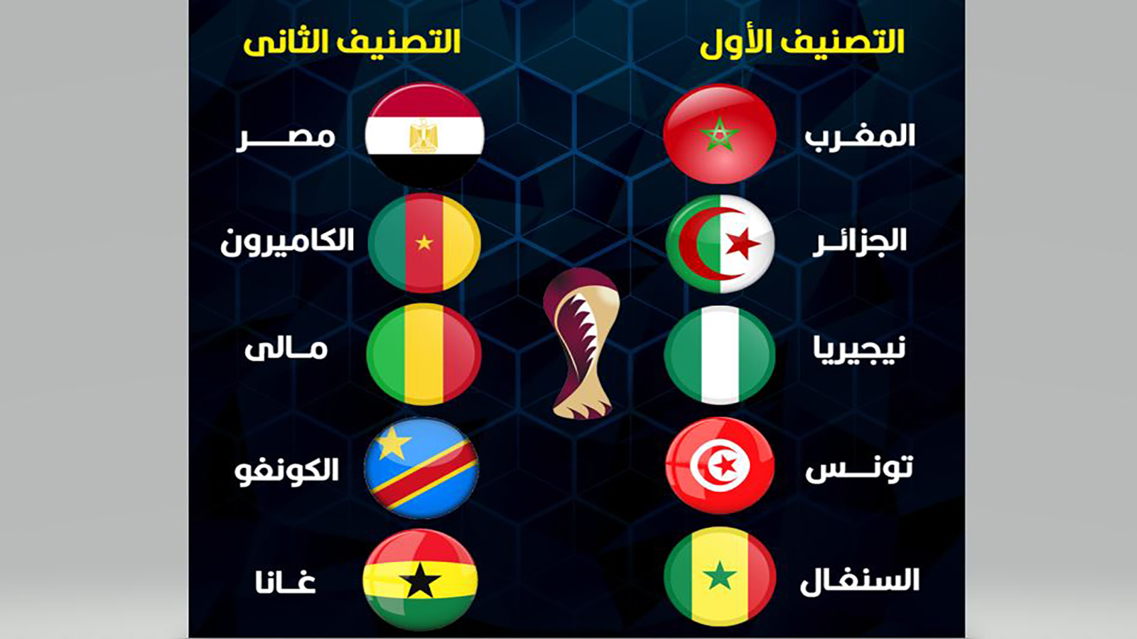المستوى الثاني: مصر والكاميرون وغانا ومالي وجمهورية الكونغو الديمقراطية.