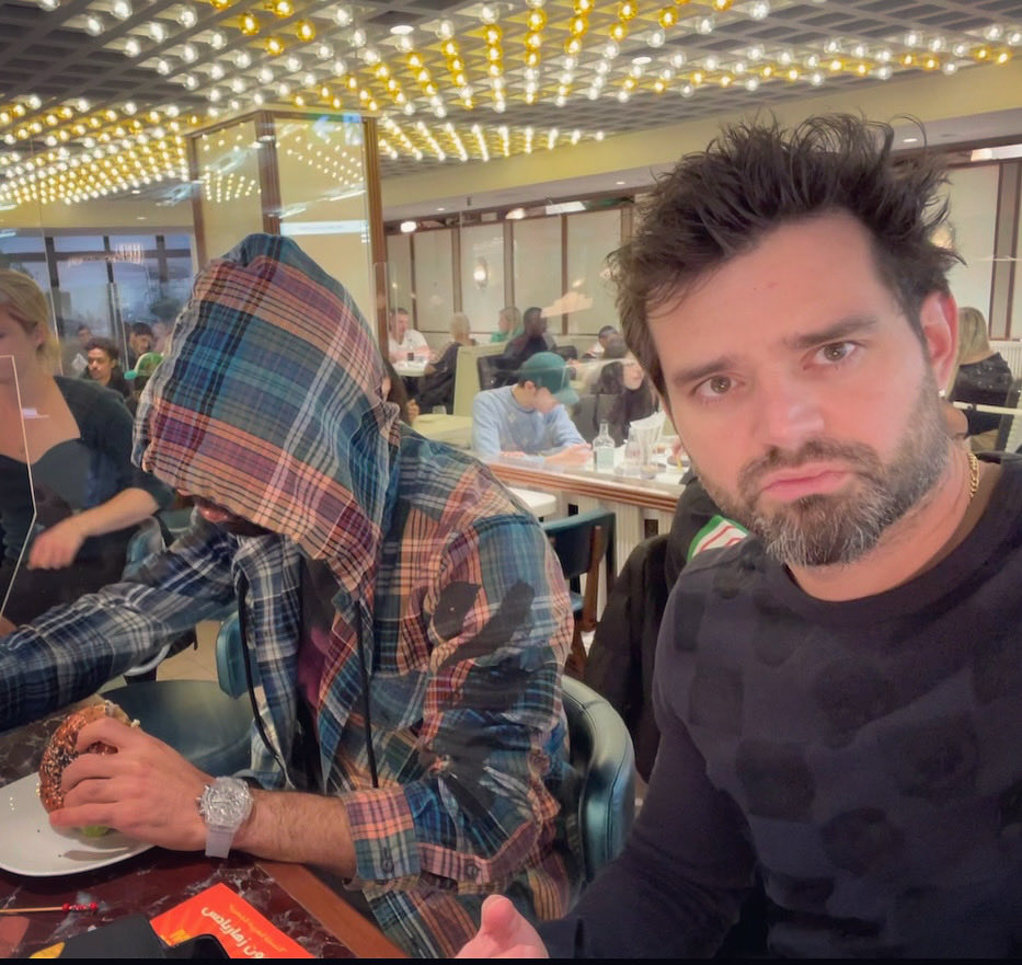 وظهر رامي عباس في أحد المطاعم يجلس بجوار شخص مغطي الرأس.
