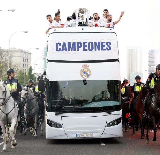 وتواجد لاعبو ريال مدريد والجهاز الفني في حافلة مكشوفة انطلقت من ملعب سانتياغو برنابيو، واحتفلت الجماهير بها على طول الطريق.