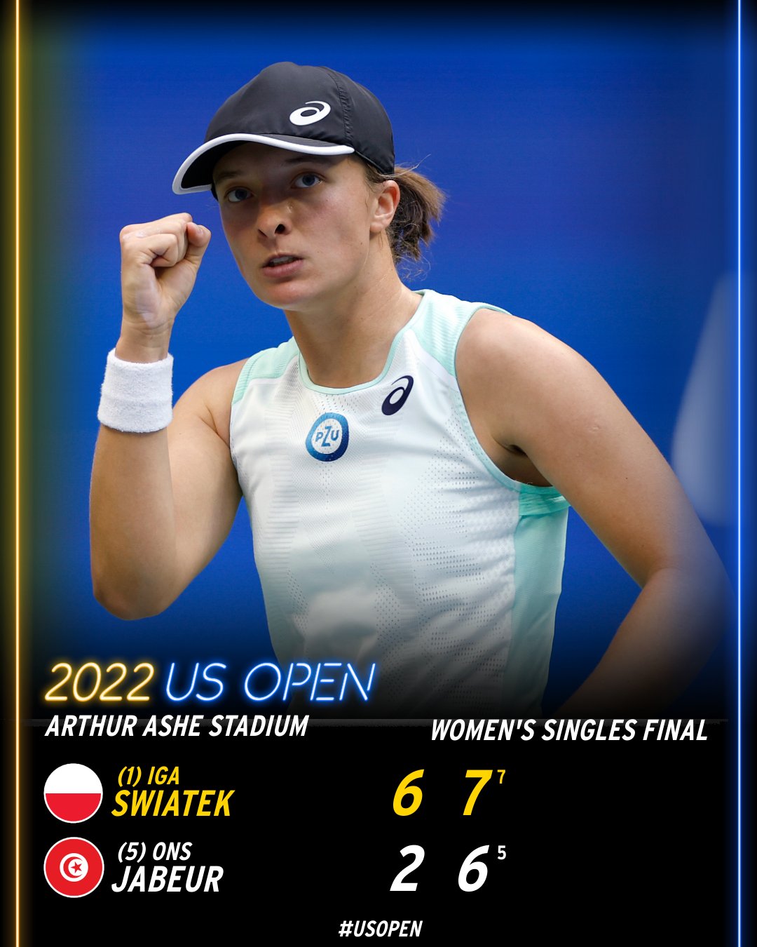 للمرة الثانية على التوالي لم تتمكن التونسية أُنس جابر المصنفة خامساً عالمياً، من تحقيق أول ألقابها ضمن البطولات الأربع الكبرى لكرة المضرب «غراند سلام»، ولكنها حققت إنجازاً أسطورياً وتاريخياً بحصولها على وصافة بطولة الولايات المتحدة المفتوحة للتنس، آخر البطولات الأربع الكبرى، فيما توجت البولندية إيغا شفيونتيك (21 عاما) المصنفة الأولى عالميًا بلقب البطولة.