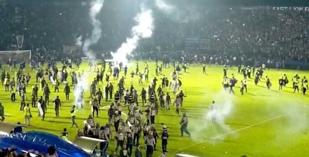 وتدافع المشجعون بذعر أثناء محاولتهم الهروب من الاستاد الممتلئ بأكثر من سعته في مالانج في جاوا الشرقية يوم السبت بعدما أطلقت الشرطة الغاز المسيل للدموع لتفريق المشجعين بعد اقتحام جماهير الفريق صاحب الأرض الخاسر الملعب بعد مباراة محلية.