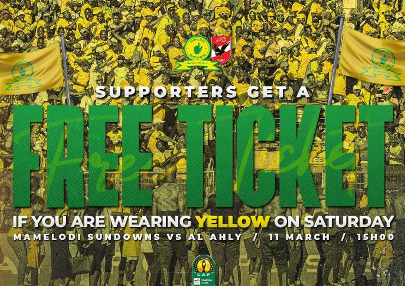 "تعالوا إلى الملعب يوم 11 مارس قبل الساعة 1400 وأنتم ترتدون اللون الأصفر أو شعار صن داونز واستمتعوا بهذه القمة الأفريقية المثيرة مجانا. ننتظر رؤيتكم".