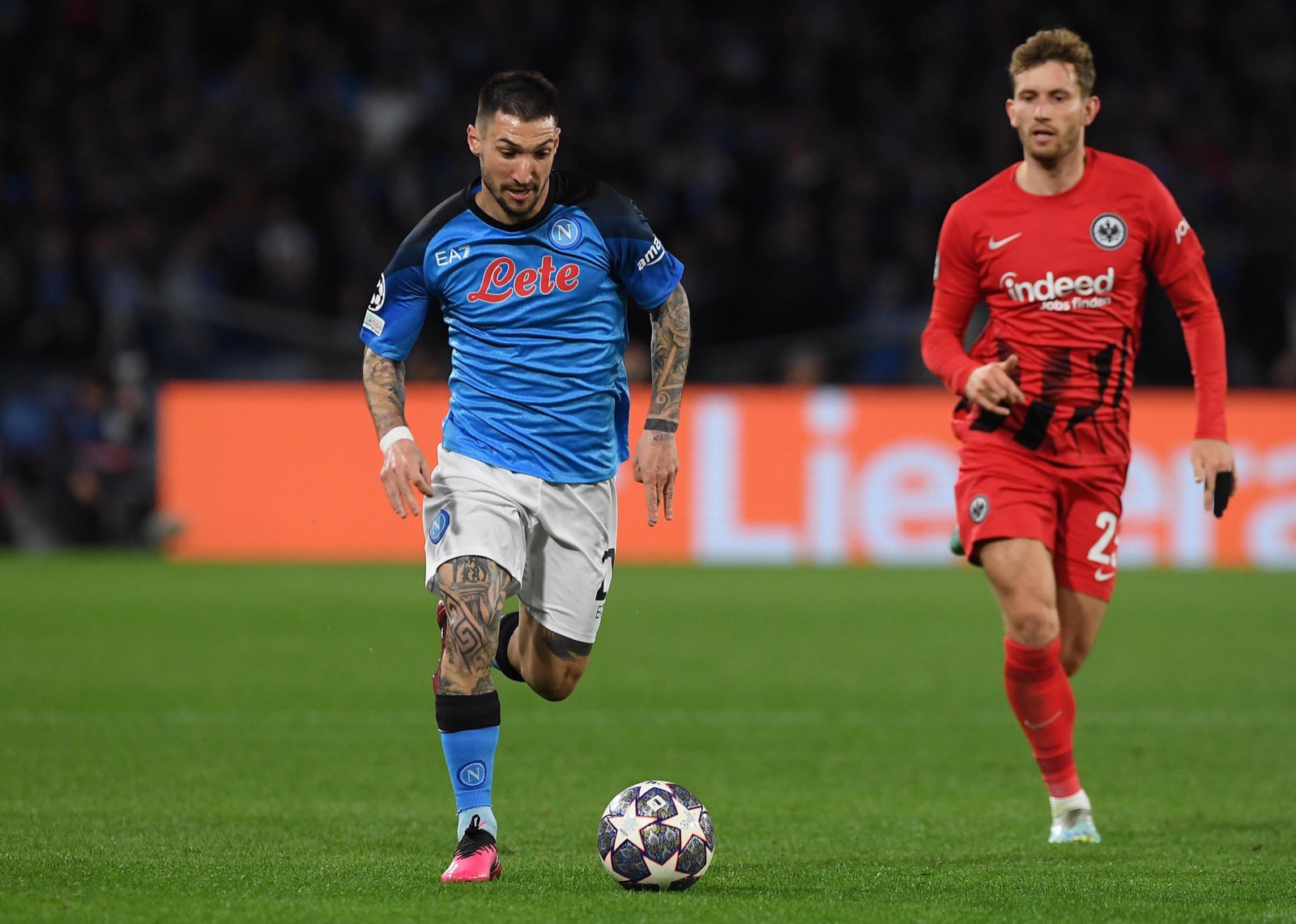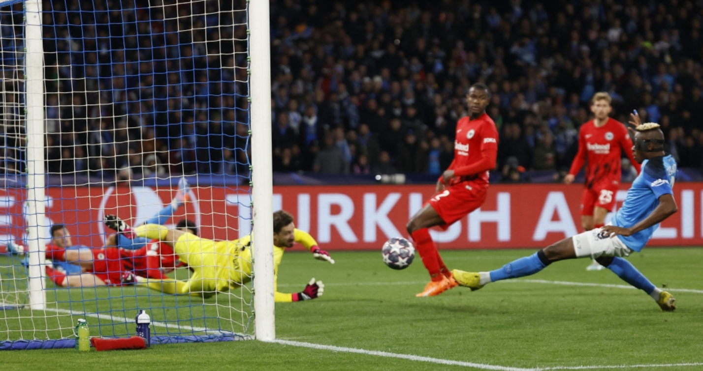 وكالعادة، كان النيجيري فيكتور أوسيمهن مفتاح فوز نابولي بتسجيله هدفاً في كل شوط (2+45 و53)، رافعاً رصيده الى أربعة أهداف في دوري الأبطال و23 في 28 مباراة ضمن جميع المسابقات هذا الموسم، قبل أن يضيف البولندي بيوتر زيلينسكي الثالث من ركلة جزاء (64).