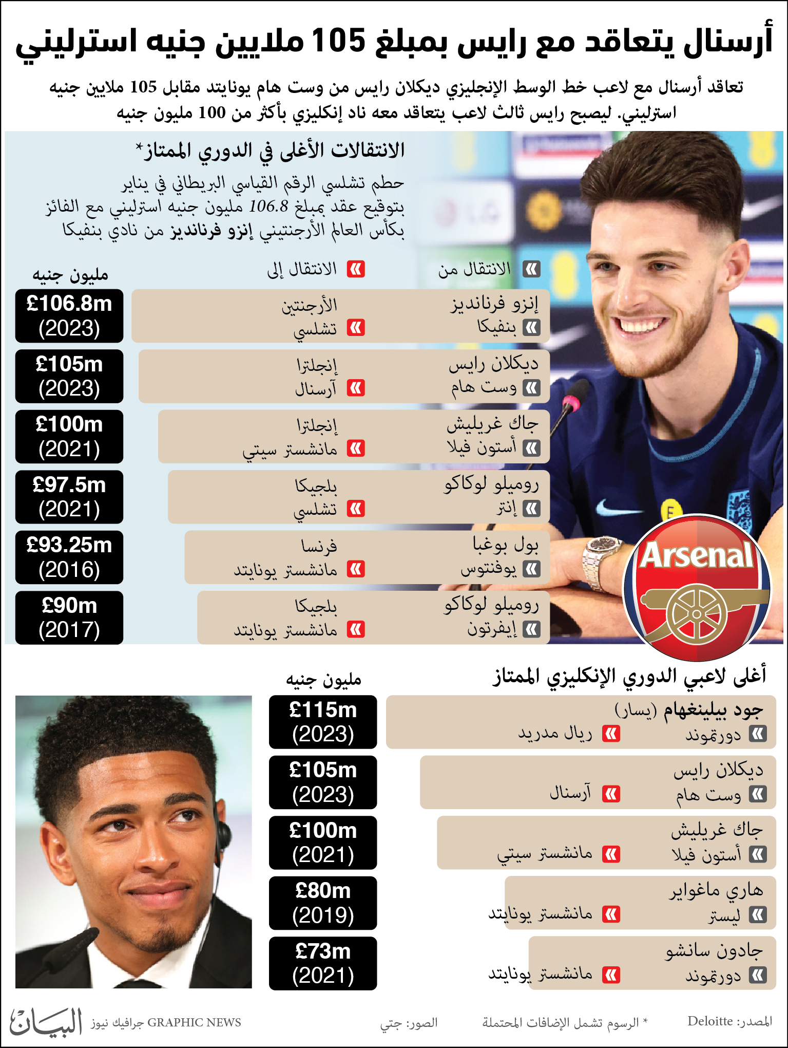 وتتخطى صفقة رايس (24 عاماً) الرقم القياسي لجاك جريليش حين انتقل من أستون فيلا إلى مانشستر سيتي مقابل 100 مليون جنيه إسترليني في 2021.