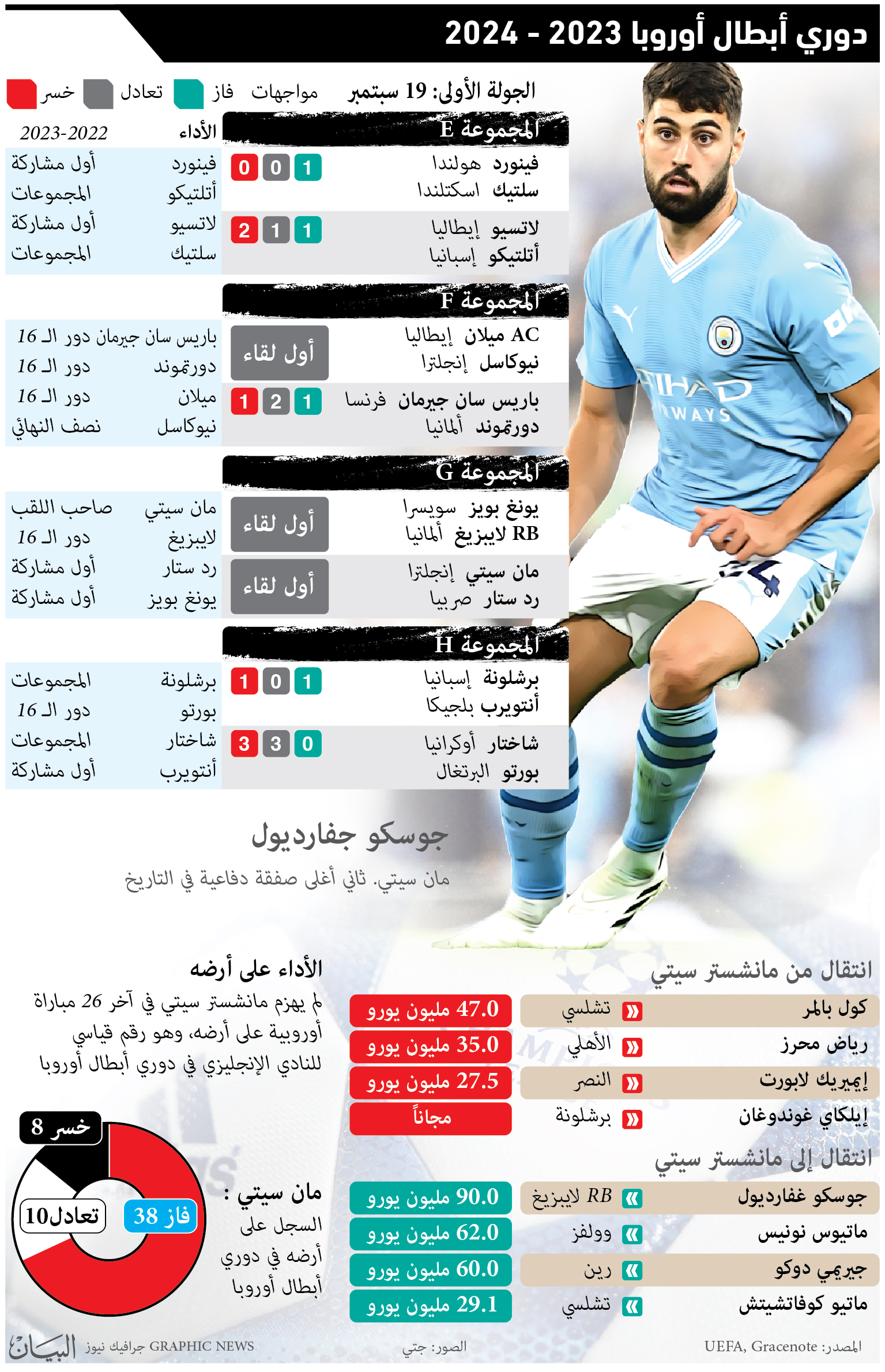 تنطلق، اليوم، منافسات دوري أبطال أوروبا لكرة القدم بثماني مواجهات، حيث يبدأ مانشستر سيتي حملة الدفاع عن لقبه الذي أحرزه الموسم الماضي للمرة الأولى في تاريخه، باختبار اليوم على أرضه أمام النجم الأحمر الصربي، بالمجموعة السابعة فيما ستكون مواجهة باريس سان جرمان وضيفه بوروسيا دورتموند بالمجموعة السادسة الأبرز في اليوم الأول من دور المجموعات، ويلتقي في باقي المباريات شاختار دانييتسك (أوكرانيا) مع بورتو (البرتغال)، وبرشلونة (إسبانيا) مع أنتويرب (بلجيكا) بالمجموعة الثامنة، ولاتسيو (إيطاليا) مع أتلتيكو مدريد (إسبانيا)، وفينورد (هولندا) مع سلتيك (اسكتلندا) بالمجموعة الخامسة، ويونغ بويز (سويسرا) مع لايبزيغ (ألمانيا)، بالمجموعة السابعة، وميلان (إيطاليا) مع نيوكاسل يونايتد (إنجلترا)، بالمجموعة السادسة. ويبدأ مان سيتي مشواره القاري بعدما حقق انطلاقة مثالية بالدوري الإنجليزي حيث فاز بمبارياته الخمس، آخرها على أرض وست هام 3 - 1.