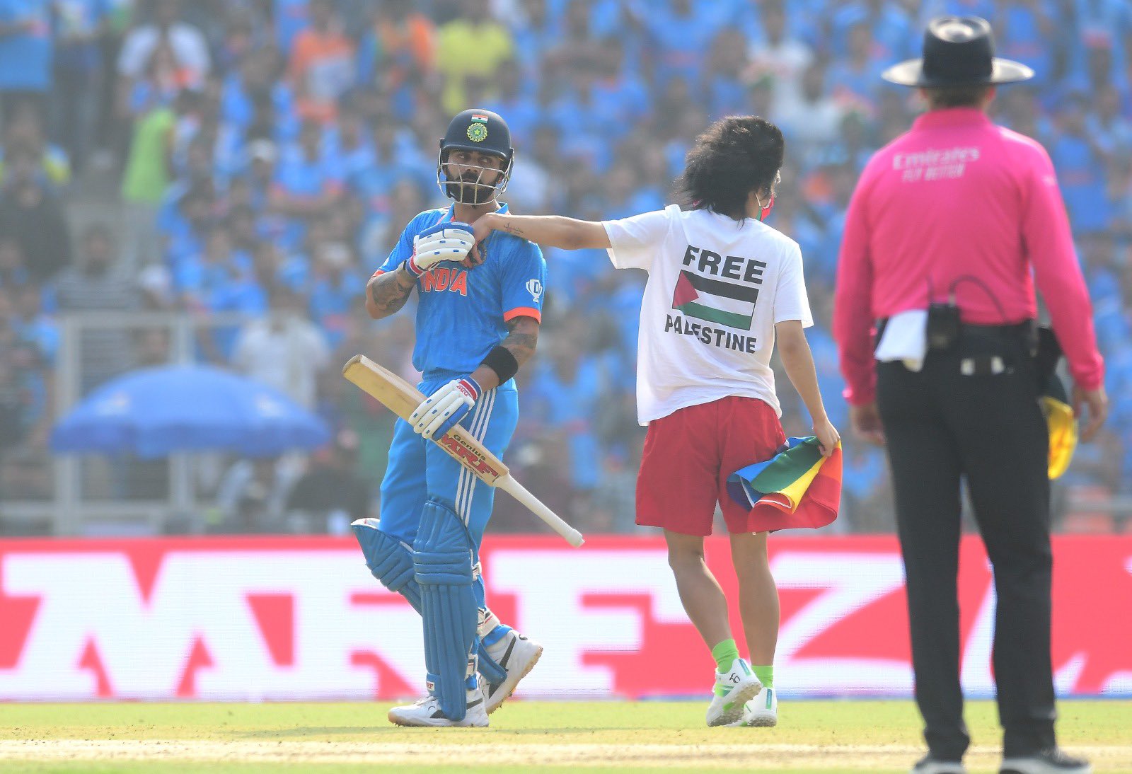 قام ناشط مؤيد لفلسطين بوقف المباراة النهائية لكأس العالم للكريكت في الهند لفترة وجيزة يوم الأحد، وتمكن من اقتحام الملعب ومعانقة نجم المضرب الهندي الشهير فيرات كوهلي.