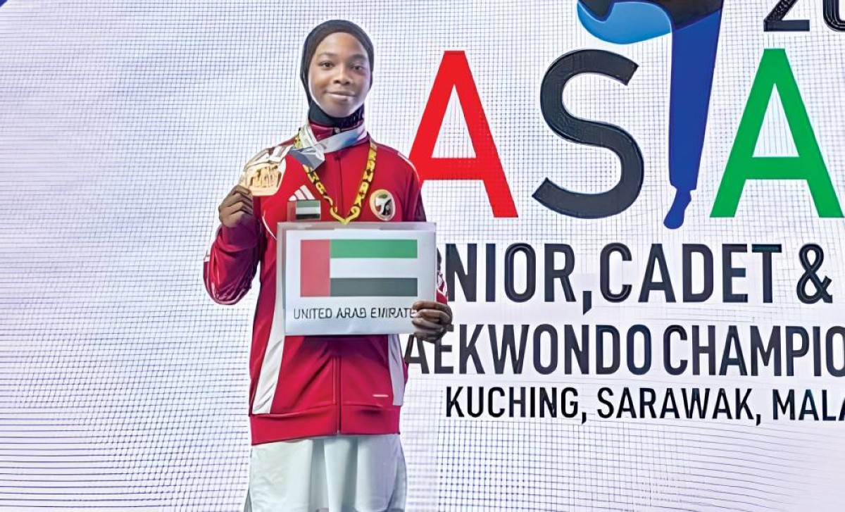 على منصة التتويج في مدينة كوشينغ الماليزية، رفرف العلم الإماراتي، بعد أن خطت فتاة في الثالثة عشرة من عمرها أولى خطوات المجد القاري في رياضة التايكواندو، مهدية وطنها ميدالية تاريخية لم تسجل من قبل في بطولة آسيا للناشئين للتايكواندو.
