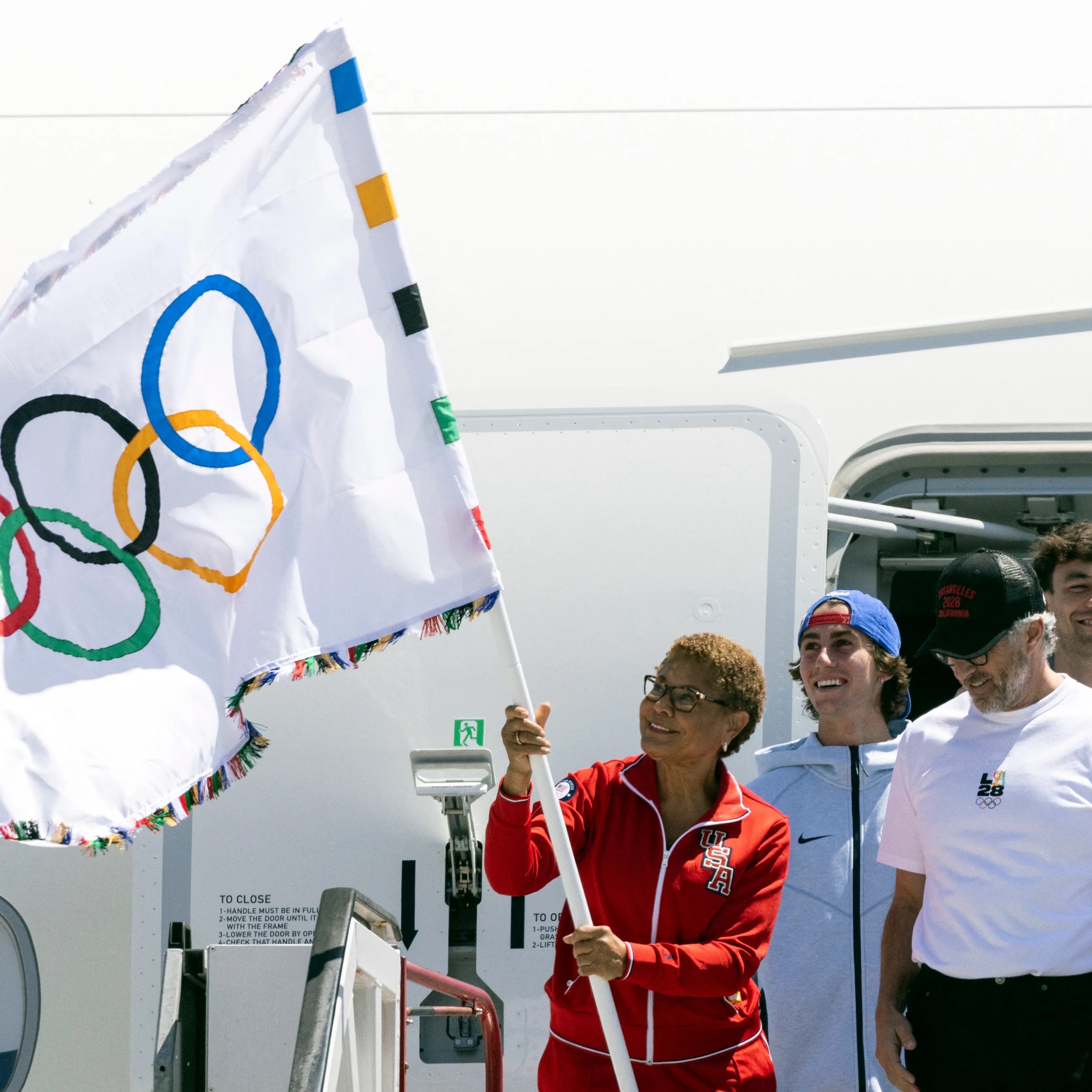 ونزلت رئيسة بلدية لوس أنجلوس كارين باس من الطائرة مرتدية زي رياضي أحمر للفريق الأمريكي وابتسمت بشدة وهي تلوح بالعلم الأولمبي قبل أن تنزل سلم الطائرة ليستقبلها حاكم ولاية كاليفورنيا جافين نيوسوم. ورافقت رئيسة بلدية لوس أنجلوس ديلاني شنيل متسابقة الغطس والمتزلج تيت كارو وآخرون.