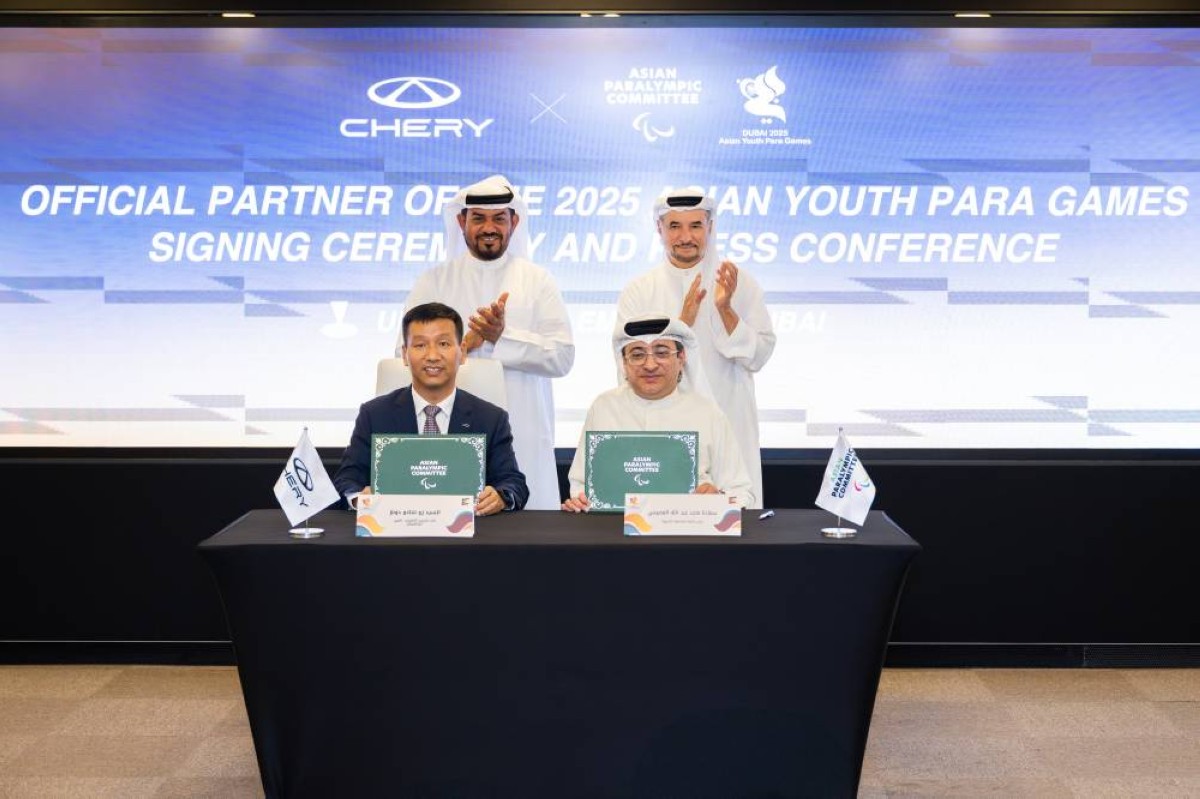 ووقع على اتفاقية الشراكة، كل من ماجد العصيمي، رئيس اللجنة البارالمبية الآسيوية، وتشو شاو دونغ، نائب الرئيس التنفيذي لشركة شيري الدولية للسيارات، خلال المؤتمر الصحافي الذي أقيم في مجلس دبي الرياضي، بحضور خلفان بلهول، نائب رئيس مجلس دبي الرياضي، وسعيد حارب، الأمين العام لمجلس دبي الرياضي، وثاني جمعة بالرقاد، رئيس اللجنة المنظمة للألعاب البارالمبية الآسيوية للشباب.