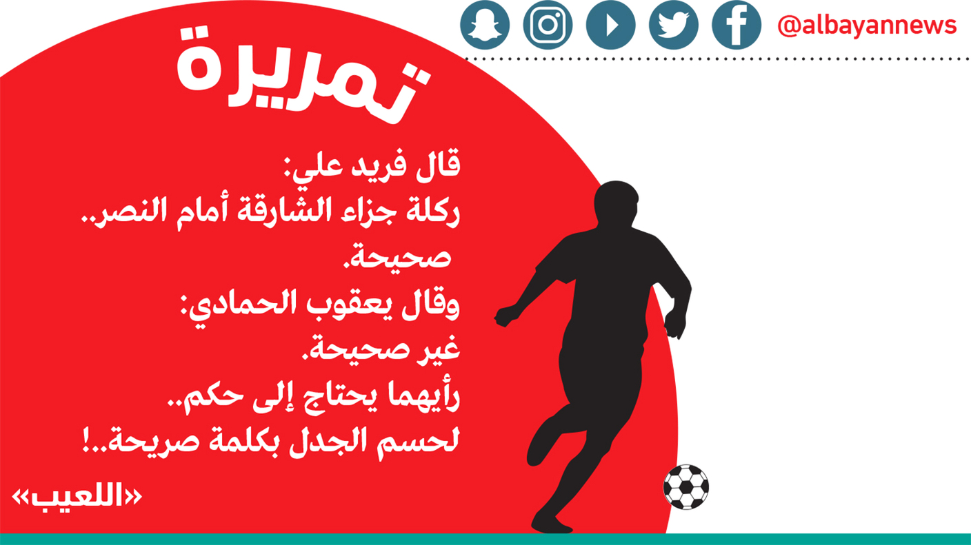 ركلة جزاء.. صحيحة وغير صحيحة!تمريرةقال فريد علي: ركلة جزاء الشارقة أمام النصر.. صحيحة. وقال يعقوب الحمادي: غير صحيحة. رأيهما يحتاج إلى حكم.. لحسم الجدل بكلمة صريحة..! "اللعيب"