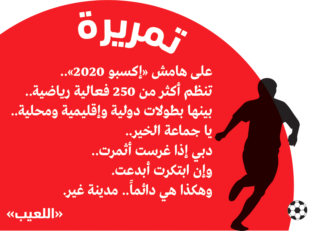 دبي إذا غرست أثمرت.على هامش «إكسبو 2020».. تنظم أكثر من 250 فعالية رياضية.. بينها بطولات دولية وإقليمية ومحلية.. يا جماعة الخير.. دبي إذا غرست أثمرت.. وإن ابتكرت أبدعت. وهكذا هي دائماً.. مدينة غير.