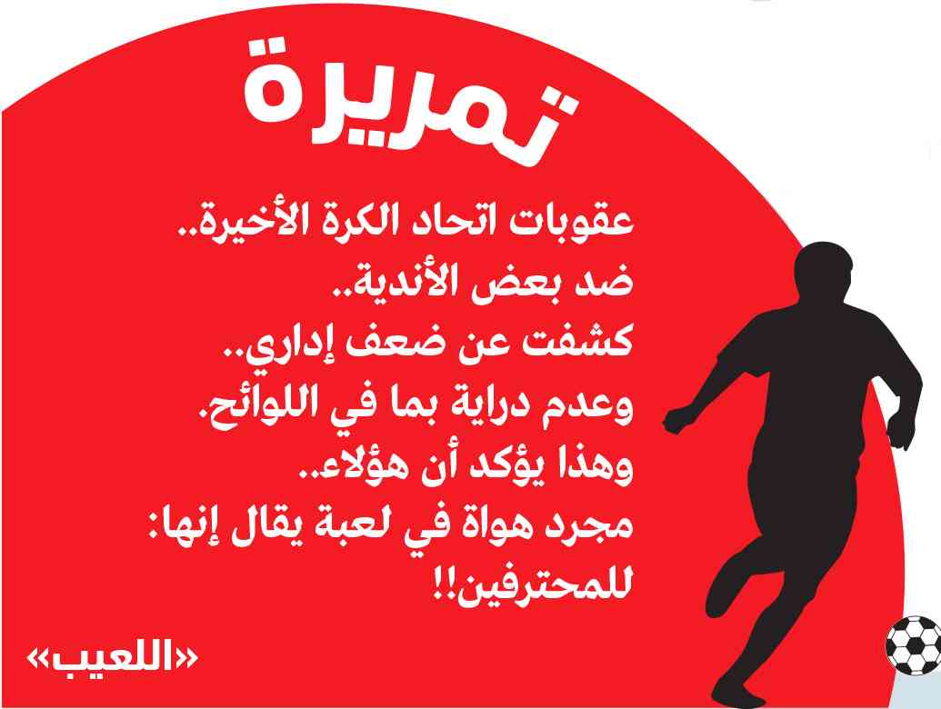 عقوبات اتحاد الكرة الأخيرة.عقوبات اتحاد الكرة الأخيرة.. ضد بعض الأندية.. كشفت عن ضعف إداري.. وعدم دراية بما في اللوائح. وهذا يؤكد أن هؤلاء.. مجرد هواة في لعبة يقال إنها: للمحترفين!!